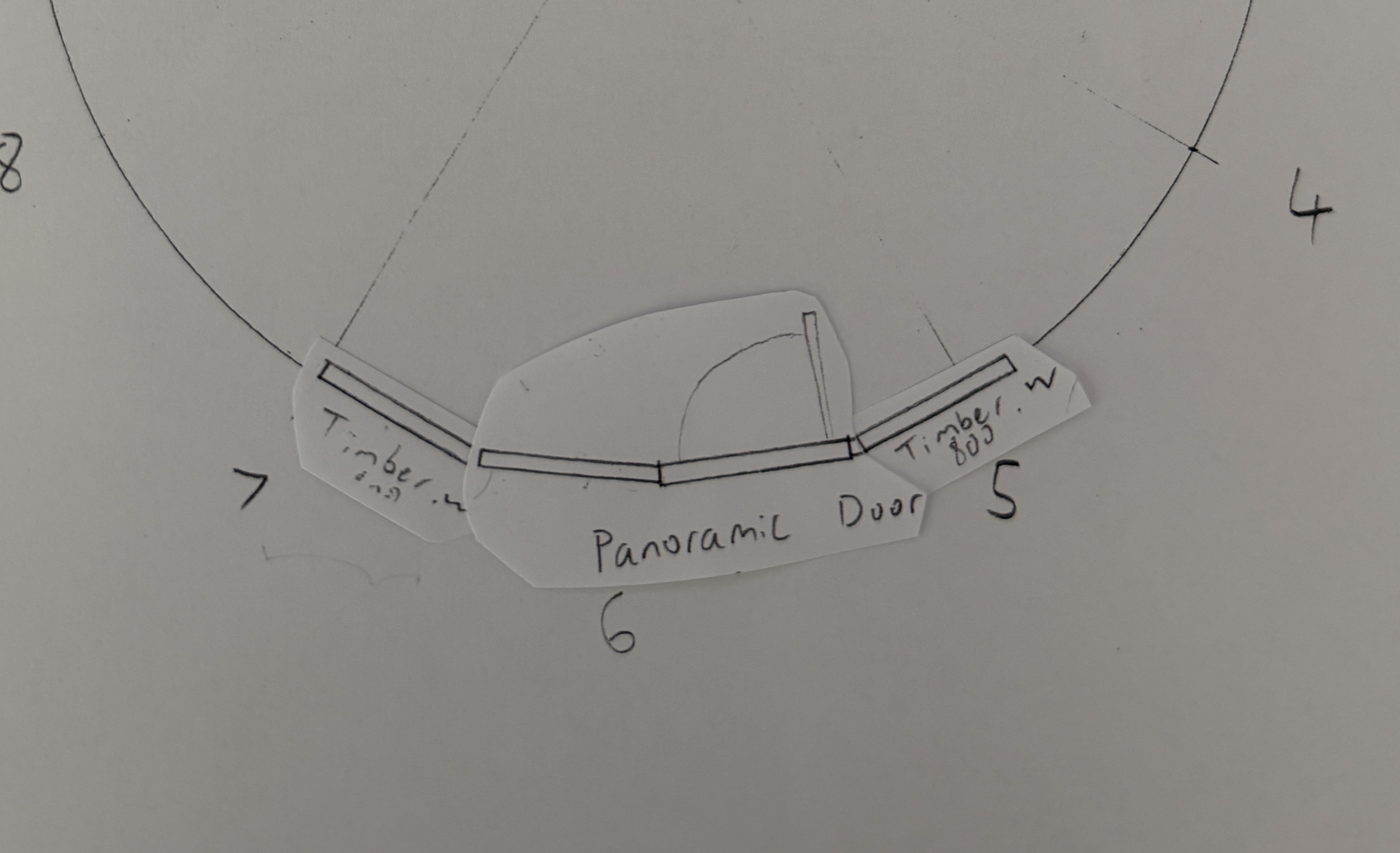 exterior shot use the mood board as inspiration create the same 6m yurt but create the door and window configuration in the sketch from left to right 1 timber awning window like in the render above 800mm wide 2 fixed panel exactually like the timber window but just a full glass panel 800mm wide 3 single door opening inward 800mm wide full glass panel 4 timber awning window the same as no 1