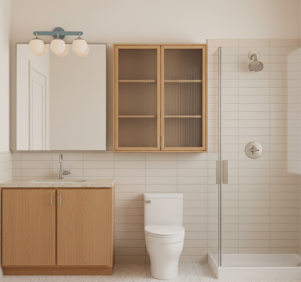show white towels rolled up inside of glass cabinet add 6 tall small potted plant on top the left side of vanity at corner of wall do not change anything else do not add any other items do not change view do not change camera angle