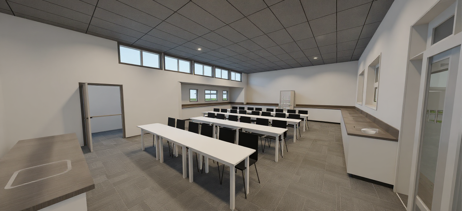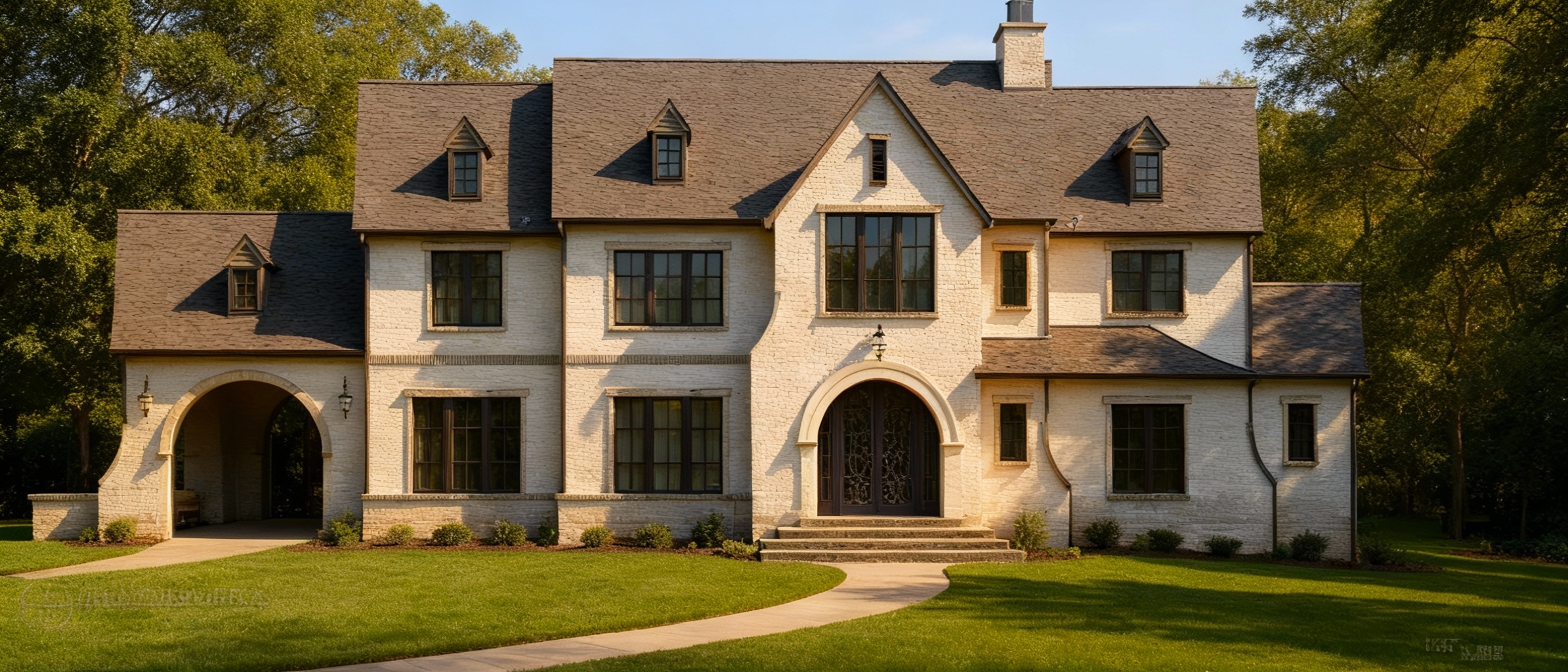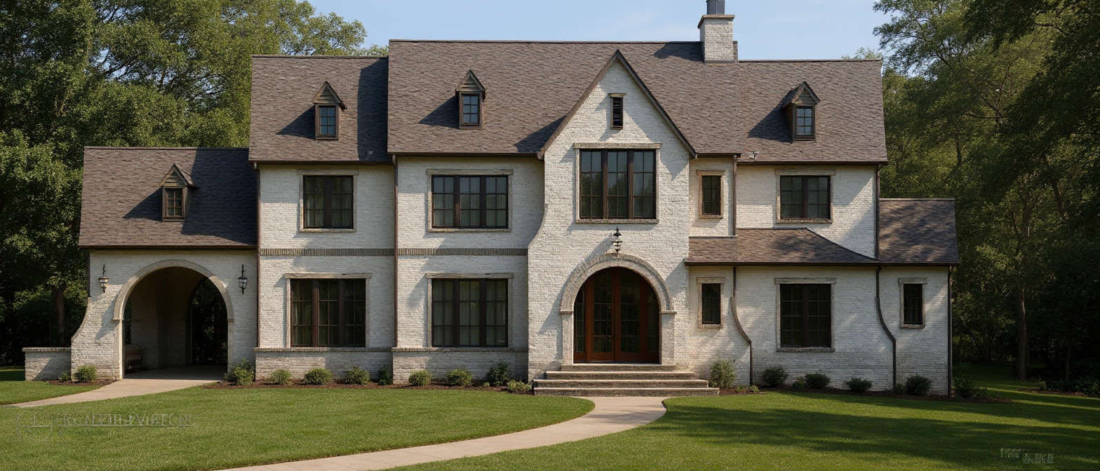 do not change shape or structural detail make front door similar style to windows but make it appear more grand and pronounced remove trees on right side of house and slope the grass down slightly