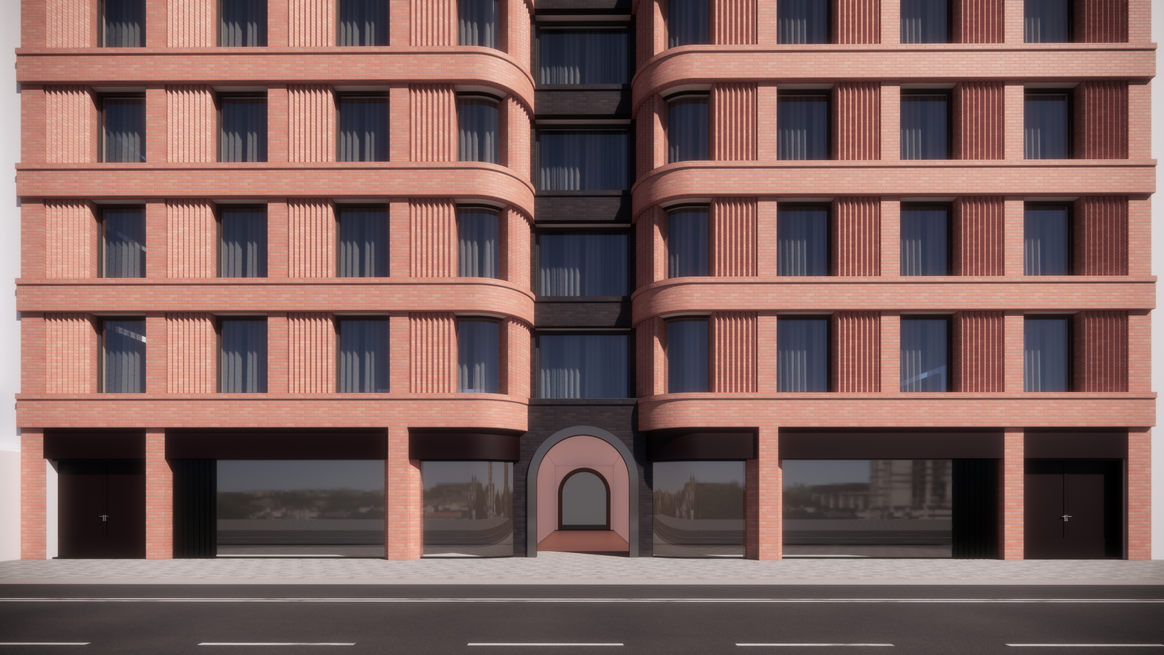 please enhance this image boosted window contrast and reflection street details with pedestrians and subtle improve brick material details upscale the image to hd do not change the geometry please note there is an opening on ground floor that pass through the building till the external on the other side