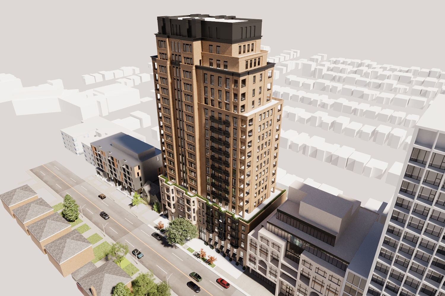make this a more photo realistic scene neighbourhood homes in the background and fall season trees and soft lighting