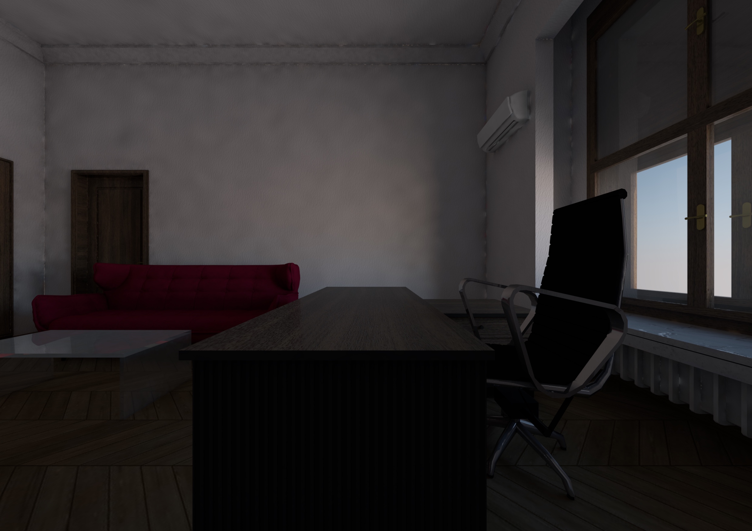 relight this interior scene using only natural daylight do not modify the architecture materials finishes furniture or camera position in any way all ceiling lights must remain turned off and no artificial light sources should be visible or contribute to the scene the space should appear illuminated exclusively by daylight entering through the existing windows create a bright evenly lit atmosphere with soft diffused light that fills the entire room light should penetrate deeply into the space gently illuminating walls furniture and corners without leaving dark or heavy shadow areas avoid strong directional sunlight or harsh contrasts shadows should be soft subtle and low in contrast use balanced exposure so the scene feels luminous but still realistic avoid overexposure or blown highlights and ensure no areas are underexposed maintain accurate material colors with a neutral to slightly warm daylight tone whites should appear clean and clear not gray or yellow the final result should feel like a naturally bright daytime interior calm and airy with smooth light gradients and a soft photorealistic quality similar to architectural photography lit only by natural daylight