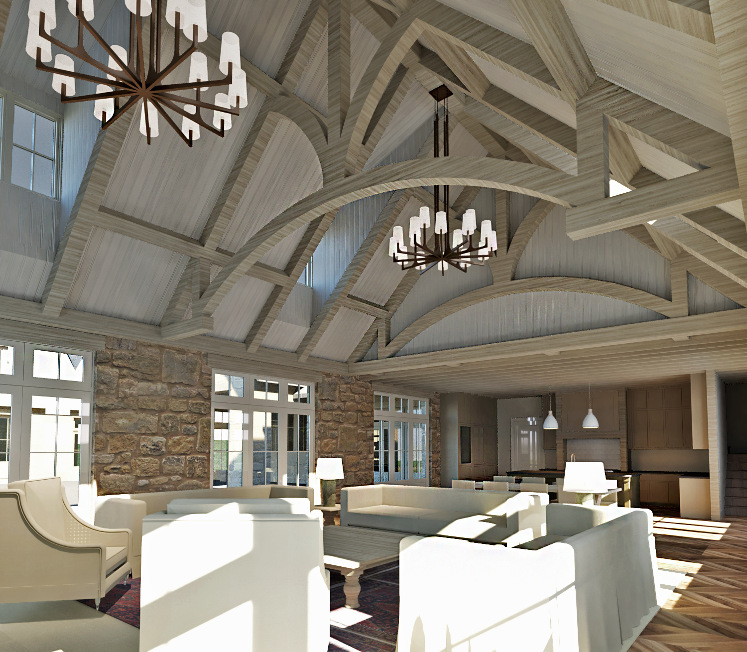 large scale stone exterior walls all window and door trim taupey beige neutral upholstery contemporary french country interiors windows face toward courtyard showing stone walls of rest of home