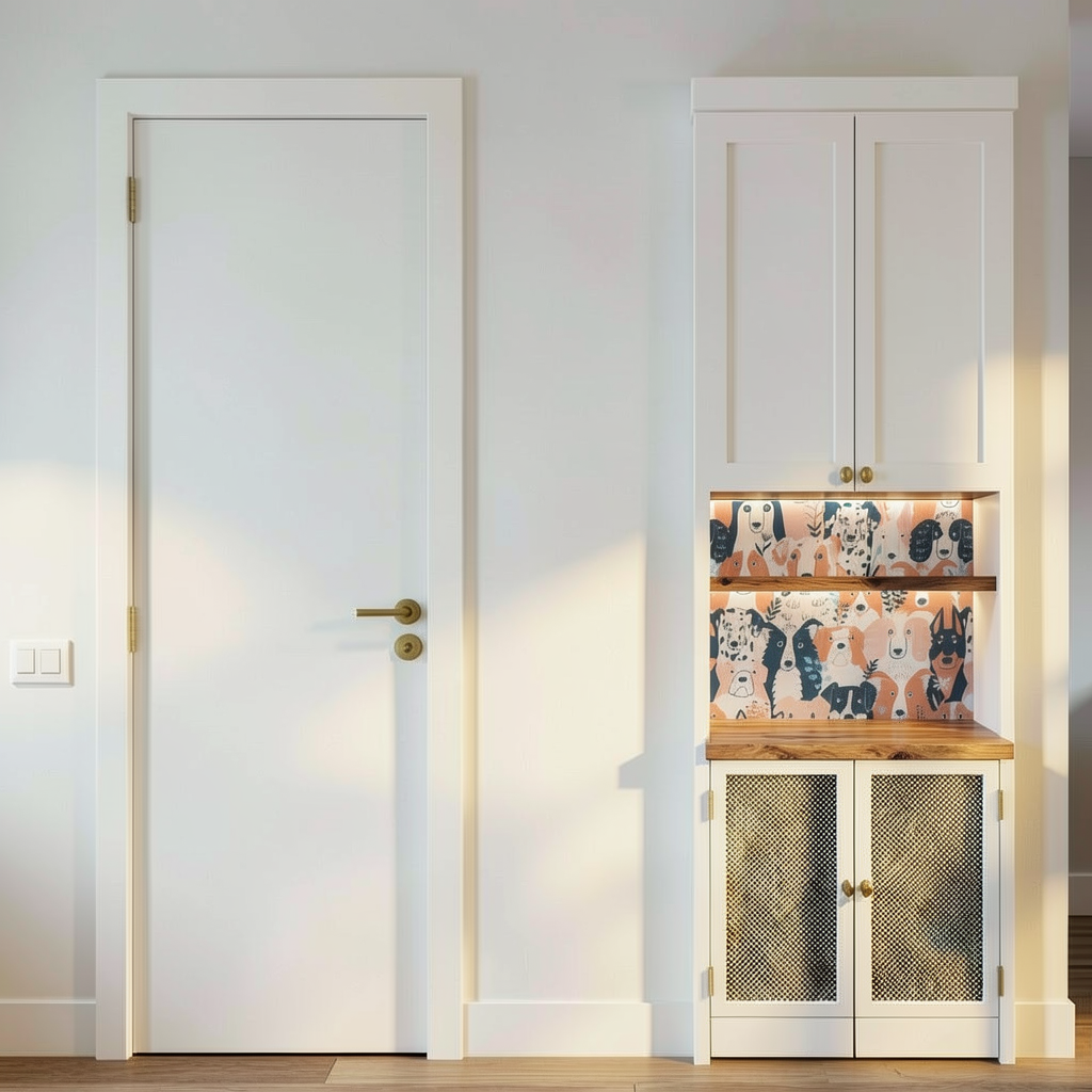 orange and blue cabins painted lap siding corten metal siding at forests edge colorado landscape snow on ground snowy path to front decks bull moose in front yard