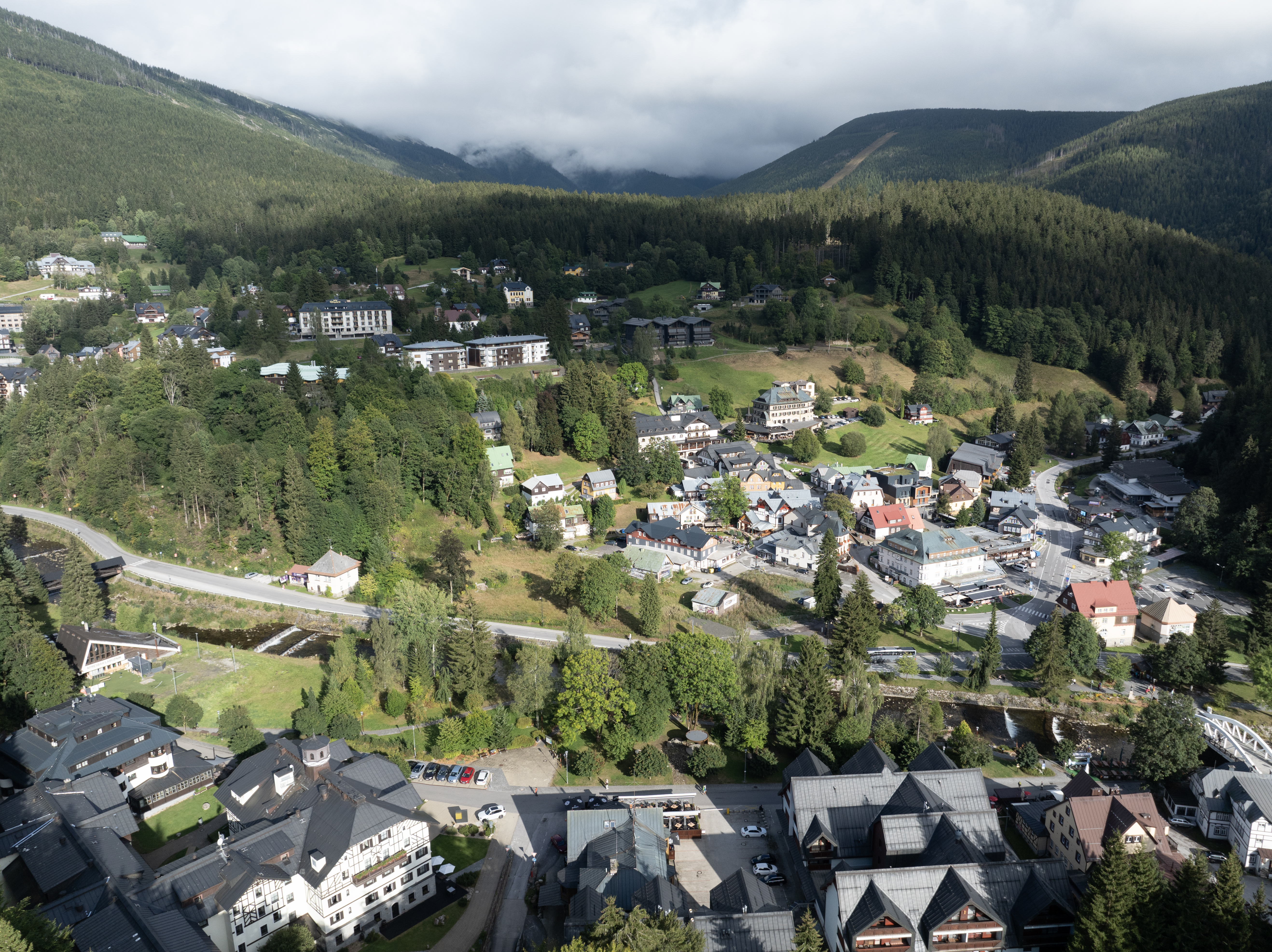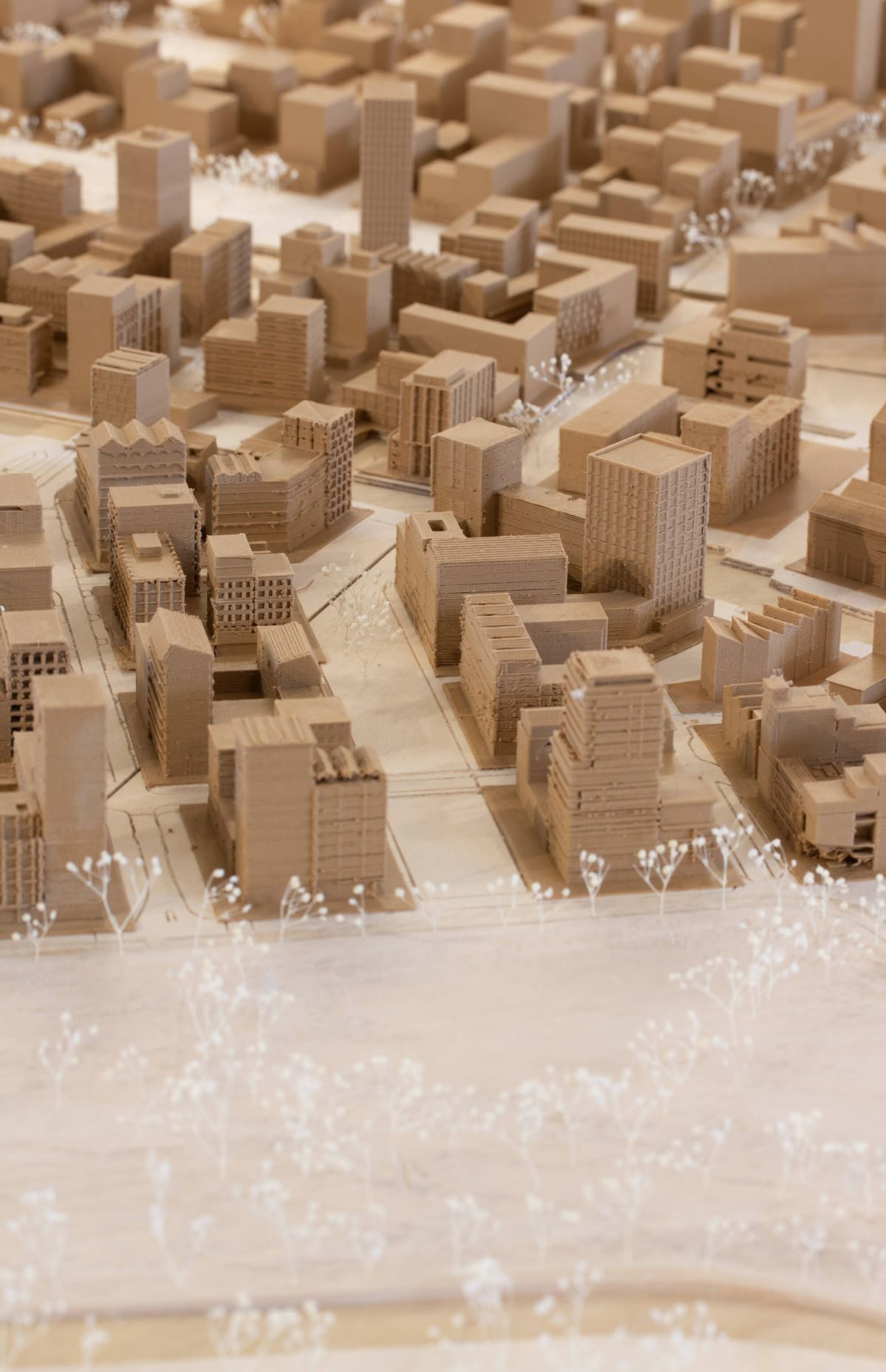 exterior shot turn thi aerial photo into a wood model of the village turn trees into white model trees like in the moodboard thee river should be plastic white