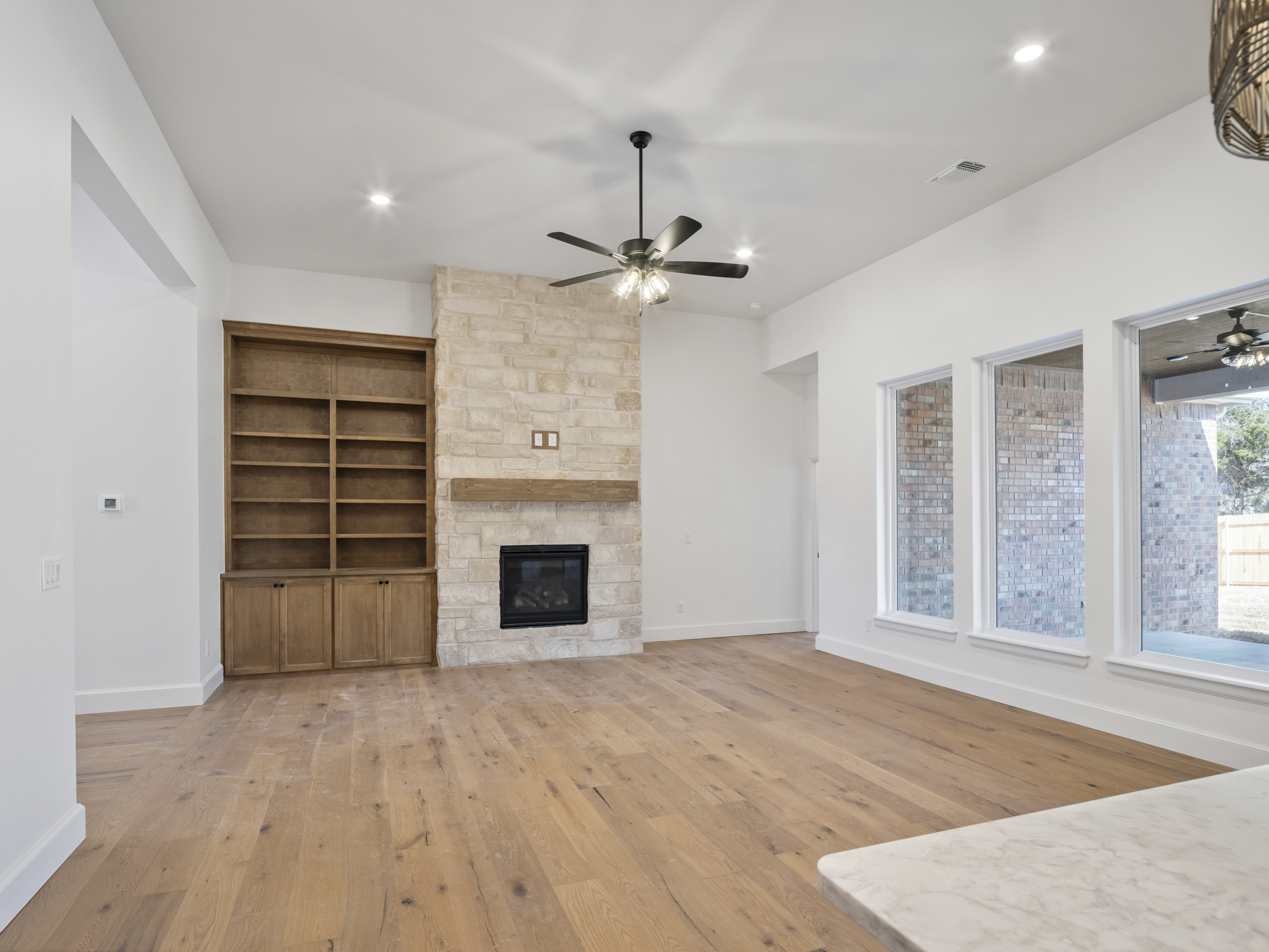 furnish the living room with cream couches and tan rug add decor to the fireplace mantle and bookcase