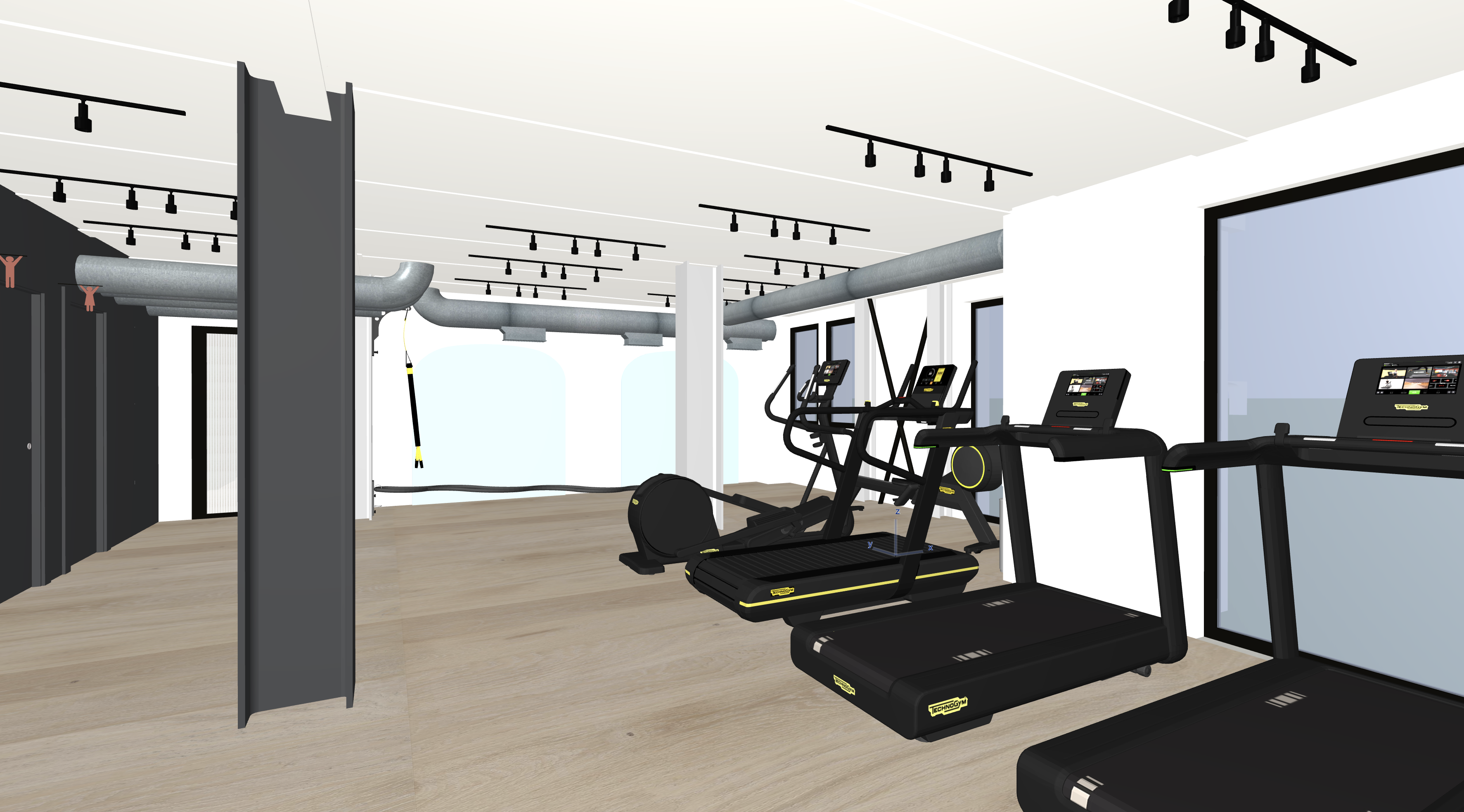 e una palestra a terra abbiamo un parquet in legno rovere chiaro continuo liscio a soffitto ci sono dei tubi in acciaio zincato in fondo abbiamo due specchi a forma di arco e spazio libero siamo al piano terra di un edificio con all esterno della vegetazione