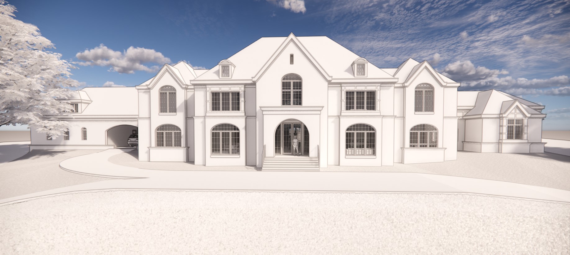 remove red color around windows add clouds to sky this facade should be lit by sunlight render style should be watercolor rendering with sketched outlines remove scale figure on the left by the stairs all would should have a warm gray tone
