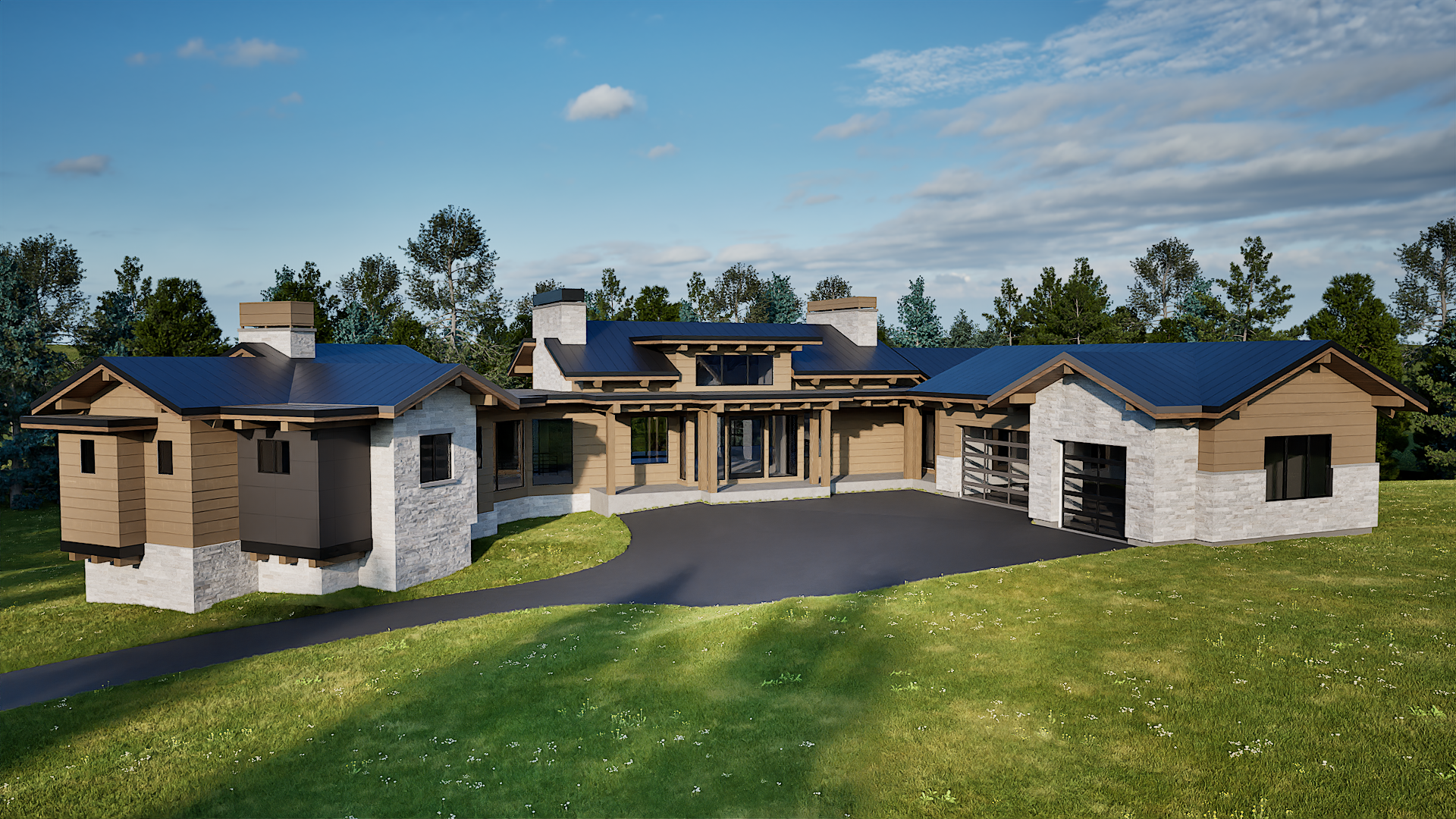 a mountain modern with dark bronze horizontal wood siding black standing seam metal roofing natural timber posts supporting the full length covered patio retain the exact structure window arrangement patio columns balcony chimney rooflines foundation height and proportions exactly as shown in the reference image add a smooth concrete front driveway extending toward the house integrated naturally into the sloped terrain surround the property with a lush dense forest of tall mixed evergreens and hardwoods place the sun behind the trees so warm golden sunlight beams through the branches casting soft rays and subtle dappled highlights across the patio siding and grass create ultra realistic lighting crisp shadows detailed textures in the wood siding and glass reflections and a vibrant clear sky with light atmospheric depth render in hyper realistic architectural visualization quality 4k resolution