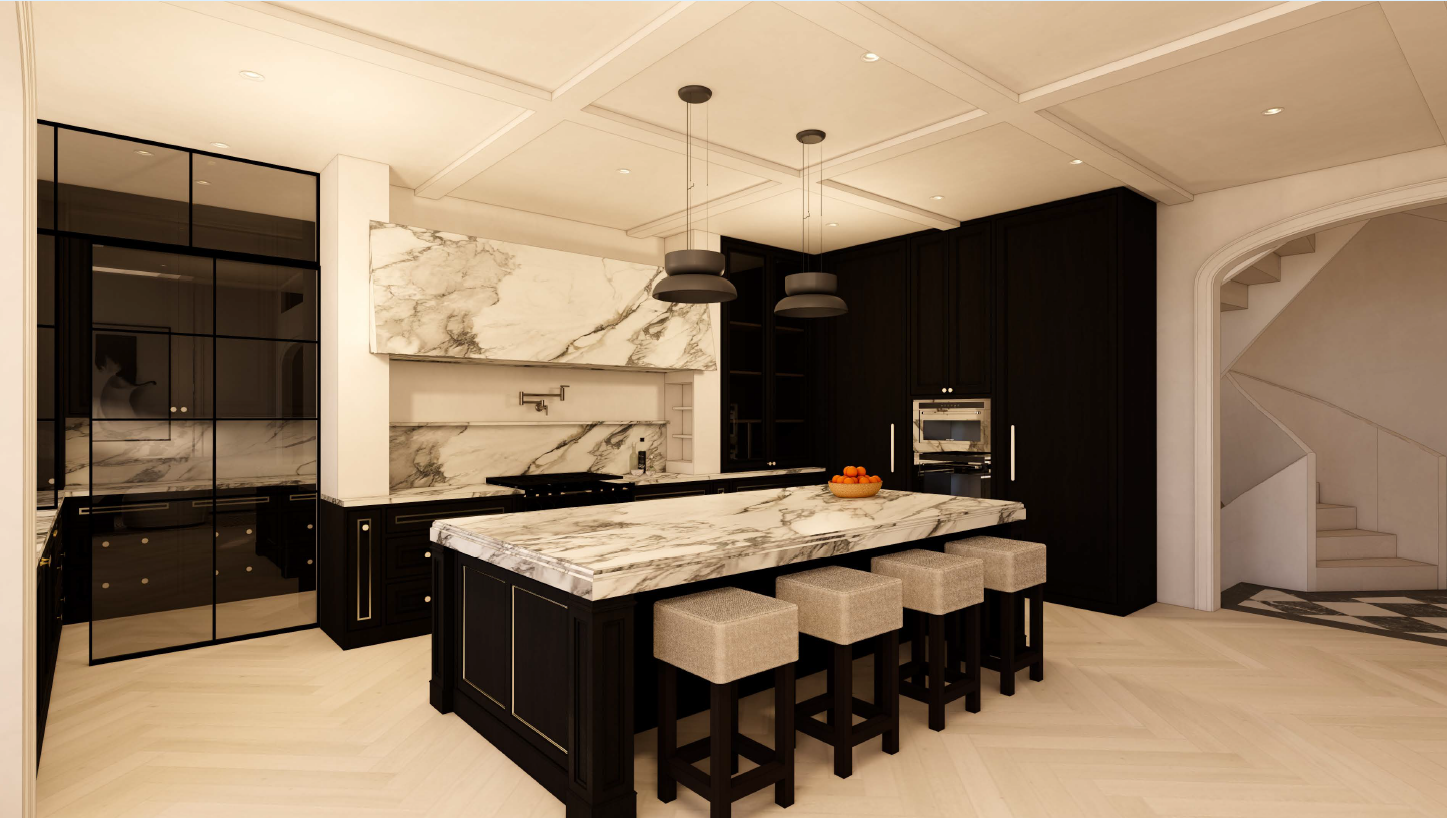 transform this kitchen to feel more architectural layered and material rich introduce a stronger focal island with fluted or tambour wood paneling and a thicker marble countertop edge increase contrast between materials darker cabinetry warm wood textures aged brass accents and dramatic stone veining make the pantry entry more architectural with framed glass or reeded glass doors emphasize craftsmanship details such as rounded island corners fluted millwork and integrated warm lighting the overall aesthetic should feel like a high end european kitchen warm textured and architectural rather than minimal or uniform