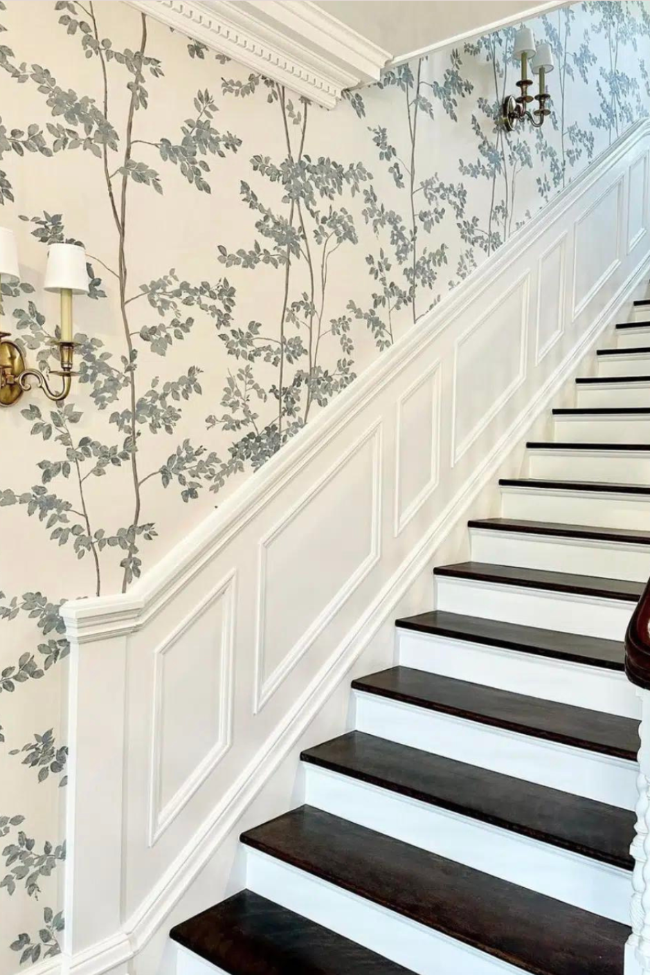 add wood paneling to wall paint it dark blue add dark geometrical runner to stairs architecture