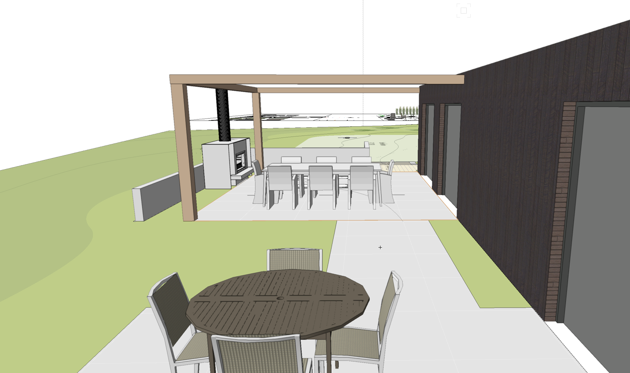 add new zealand native planting only grass at back upper area above wall add roof to house add people sitting at table fire in the fireplace add country view in background