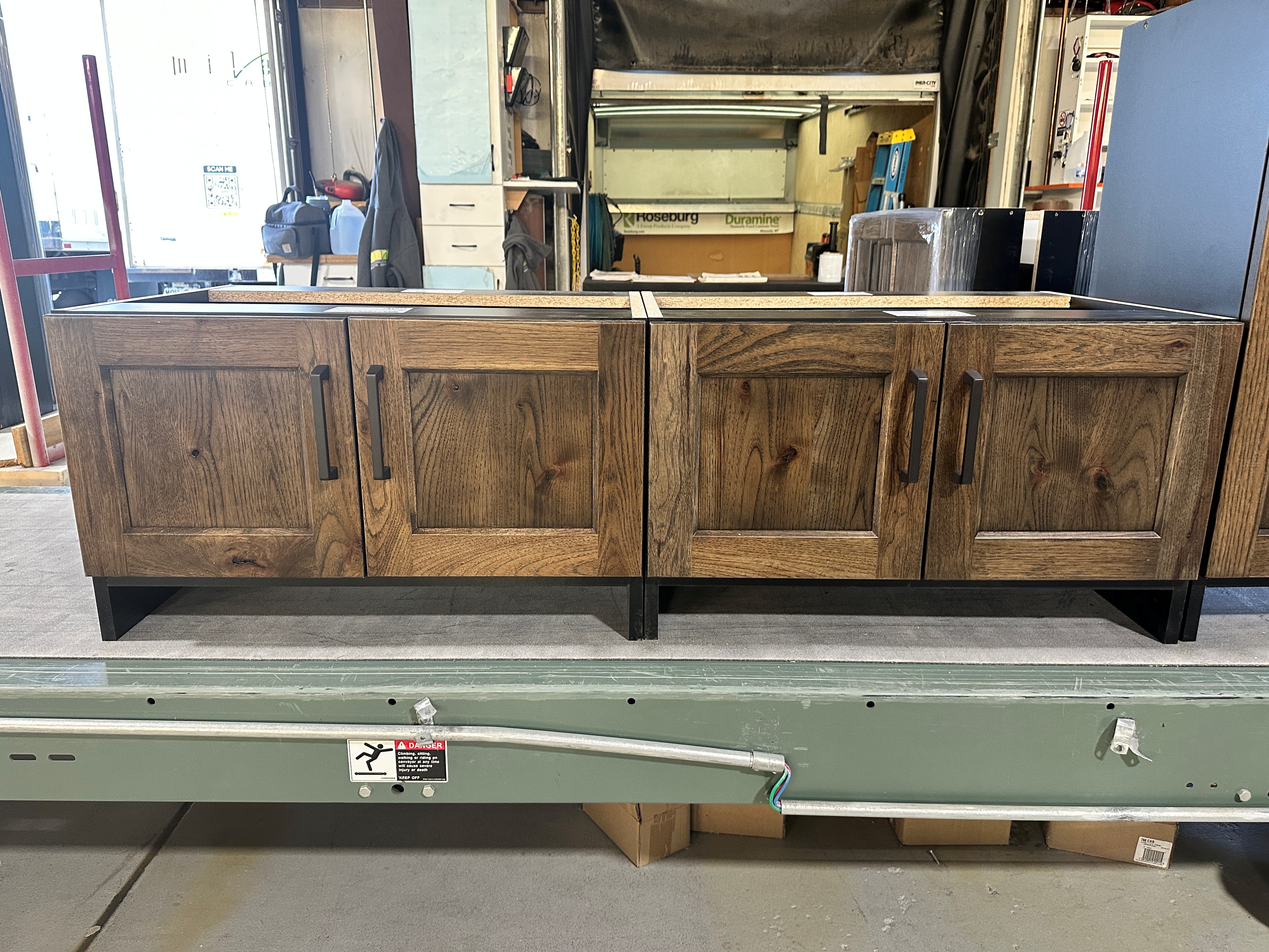 change these cabinets to become a bench with a nice wood top and cushion add simple square furniture base to cover the unfinished toe kick change the entire background to make this look like it is a nook in a house make the lighting look natural while keeping the colors and textures of the cabinet doors no matter what close the gap between the cabinets and add flush fillers