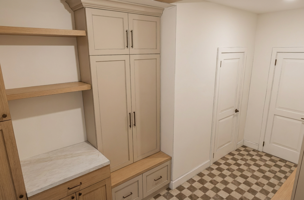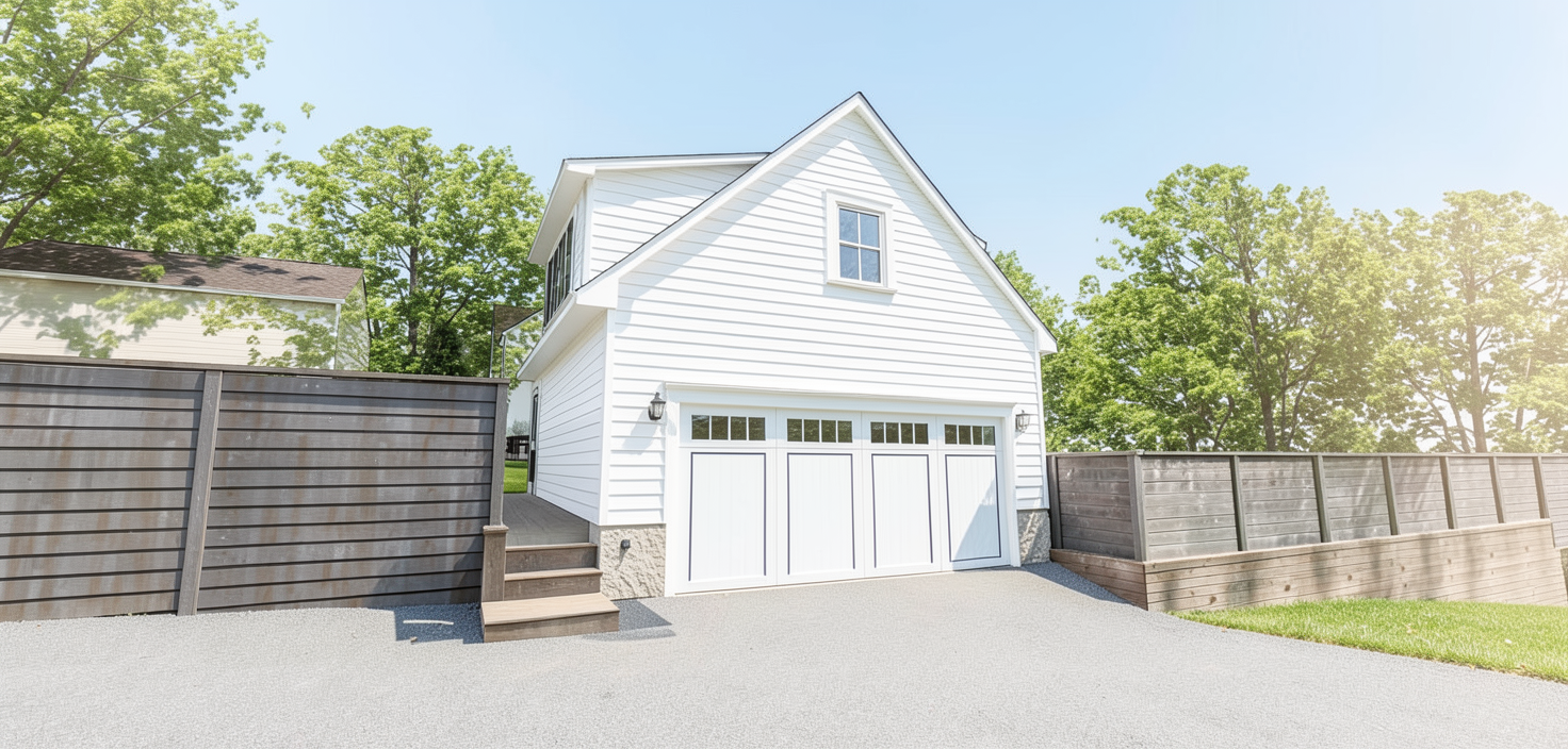 black framed windows contemporary style stucco with modern accents add some mature trees in the background add a walkway to the steps add a driveway to the garage door give the building a modern limestone look add some ornaments add more limestone detail to the building make it early afternoon with a nice sky only make the windows rail and light fixtures look black keep the building and the roof caps a light color also show the brick as noted in a modern darkish black grey tone to fit the theme make the window and door framed in black make the awning above the door black as well make the window trim blend into the surrounding material make the flat roof caps light in color show the steps on the left goin towards the backyard