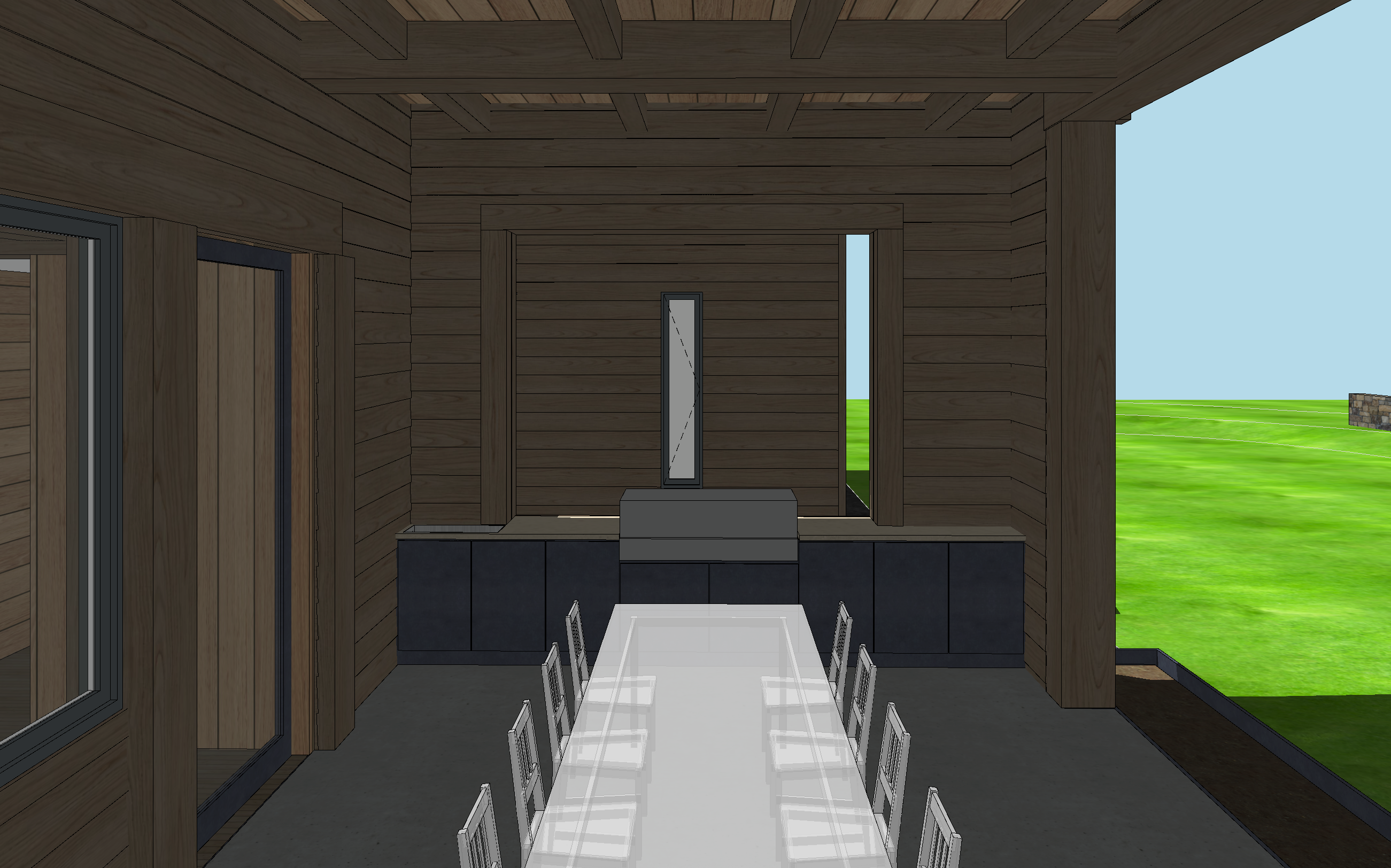 outdoor patio furniture blackened steel cabinets stainless steel grill insert stainless steel sink basin medium light tone brown wood siding with beams a few shades darker mountains of sun valley idaho in the distance people sitting at table enjoying a meal someone opening the grill with a spatula in hand
