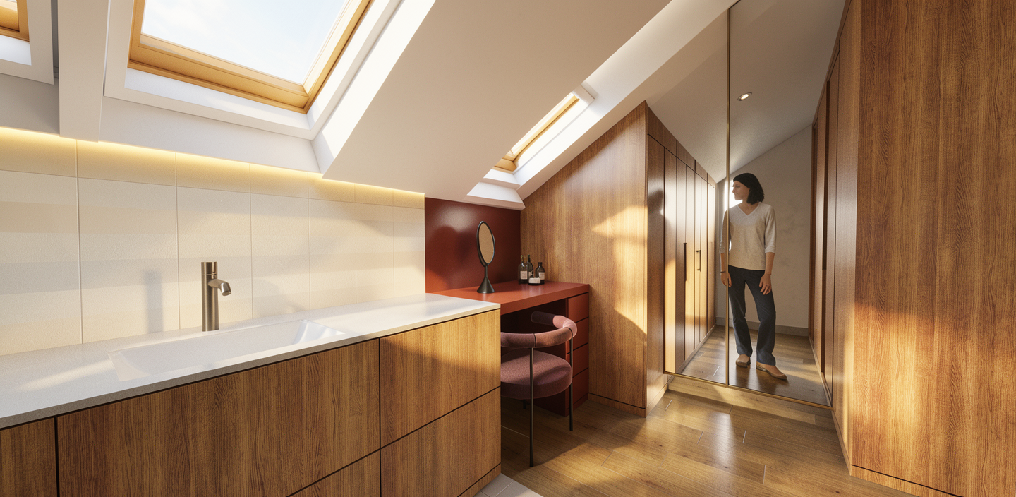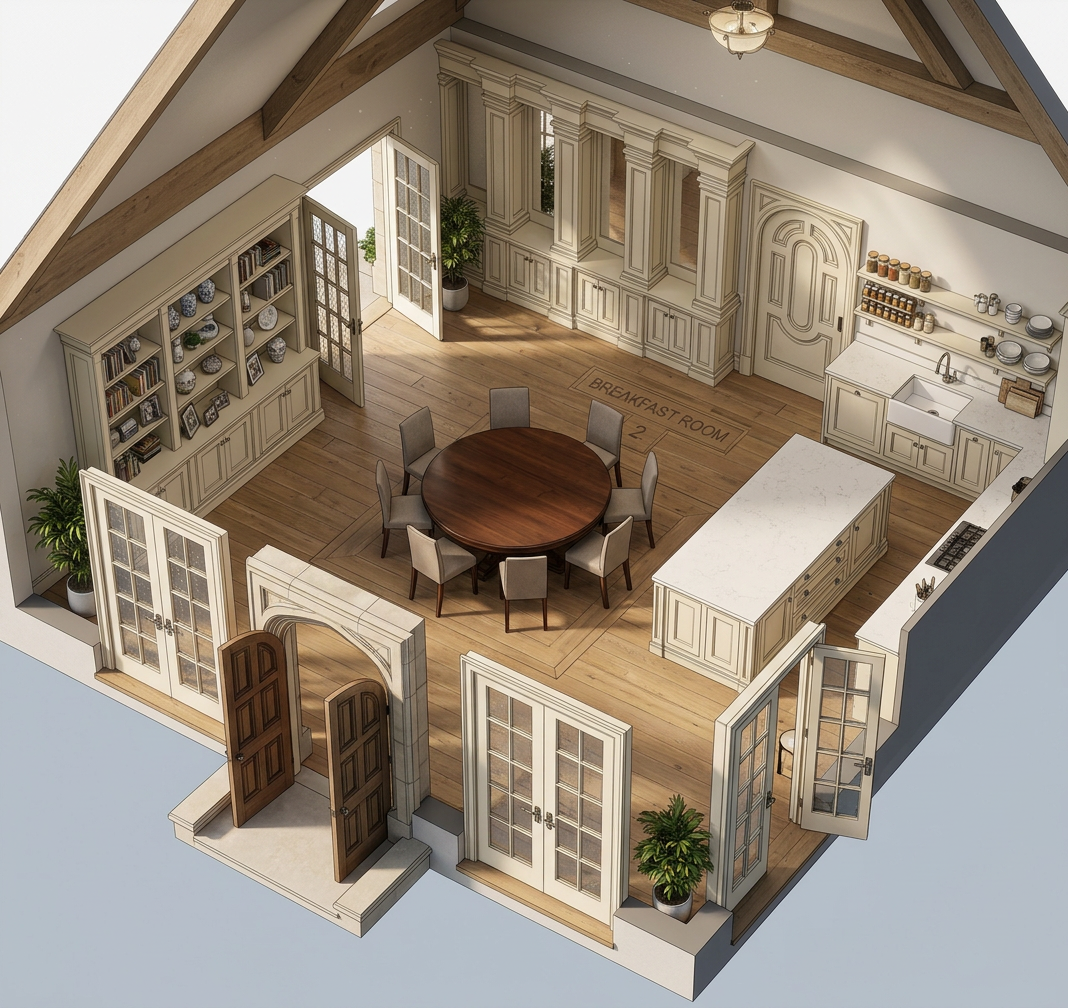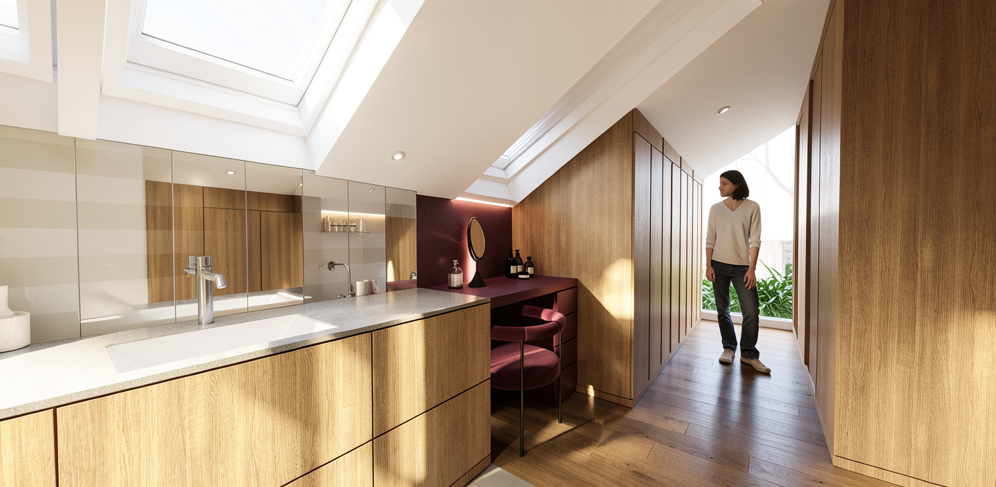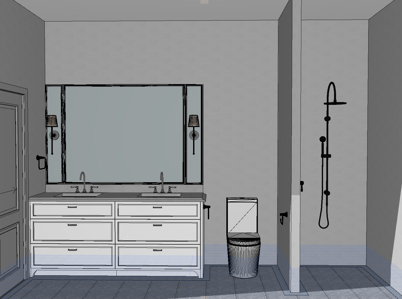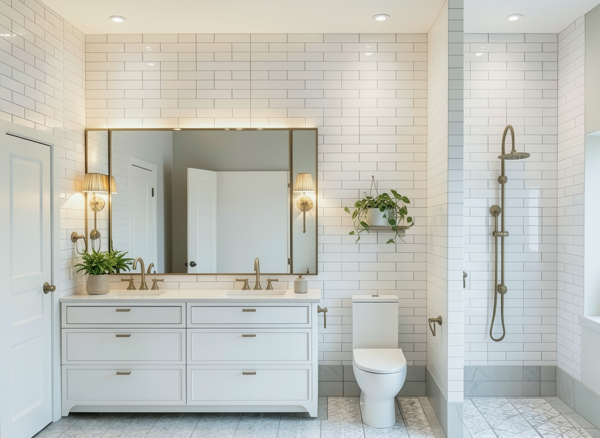 please make this look photo realistic the walls are white subway tiles the tapware shower and hardware are all polished chrome the cabinetry and frame to the mirror are white the wall lights are polished nickel the floor tile is a pale blue and white marble mosaic tile in a versailles parquetry design