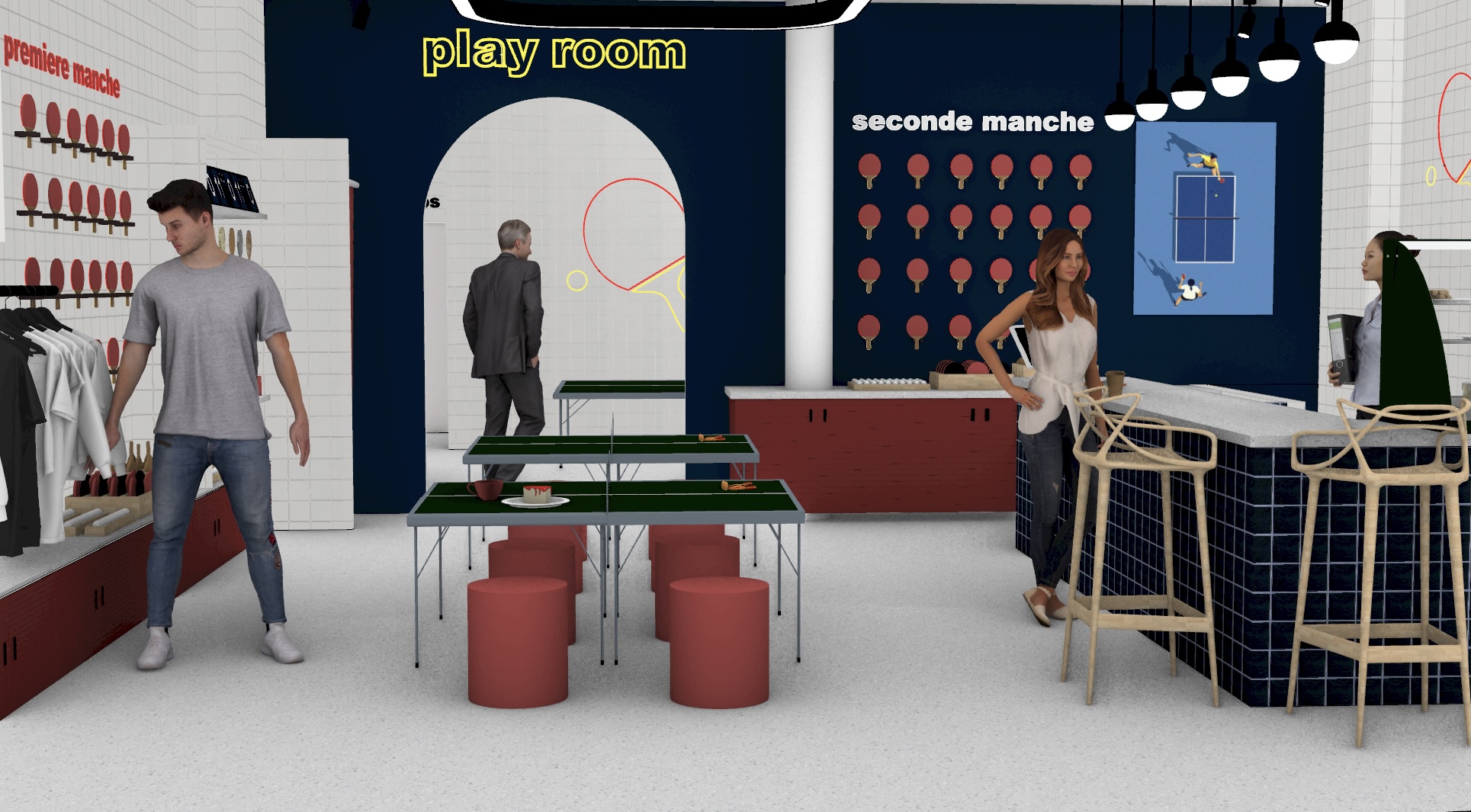 create a modern table tennis lounge with a clean aesthetic use a palette of navy blue for the walls accented by red ping pong paddles mounted in organized rows incorporate bright white tiles with a subtle grid pattern for the walls and floors to provide a crisp contrast feature a play room sign in bold yellow design a sleek minimalist bar area with dark blue tiles and light wooden stools add pops of vibrant red through stools and table markings portray a relaxed social atmosphere with natural lighting and subtle shadows making it feel inviting and contemporary architecture