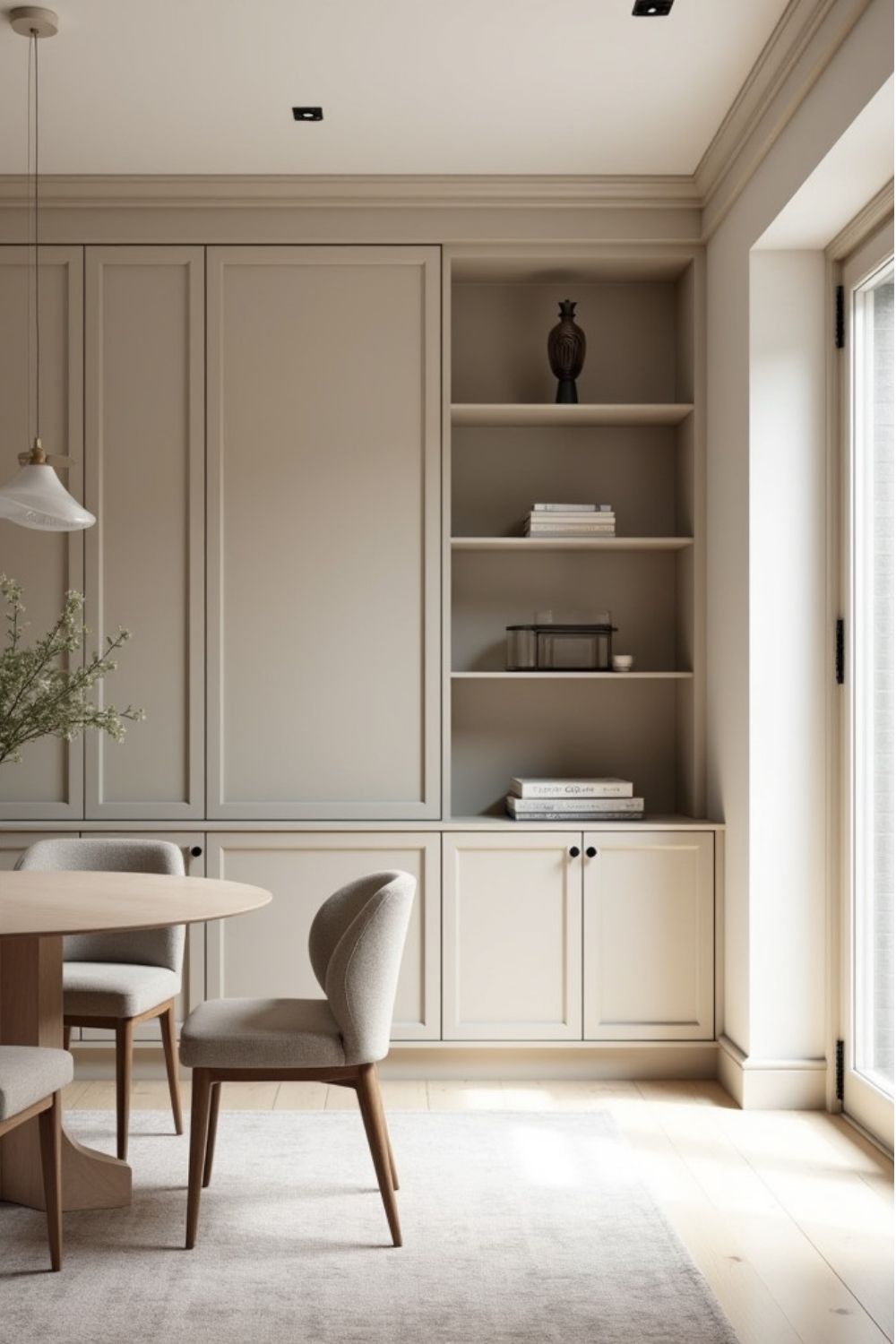 modernist exterior shot interior minimalist scene with soft natural daylight entering from a large window on the right in the foreground a round wooden dining table and modern upholstered dining chairs in light beige fabric replace the entire background furniture cabinets shelves objects decor with a clean continuous white textured wall subtle plaster finish slightly matte keep the original lighting direction and soft shadows on the floor light wooden floor preserved overall neutral warm tones with a refined scandinavian inspired atmosphere architecture
