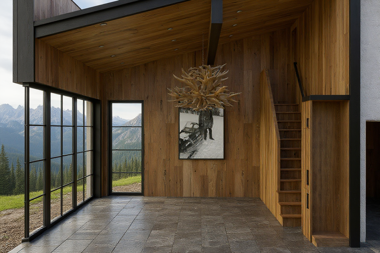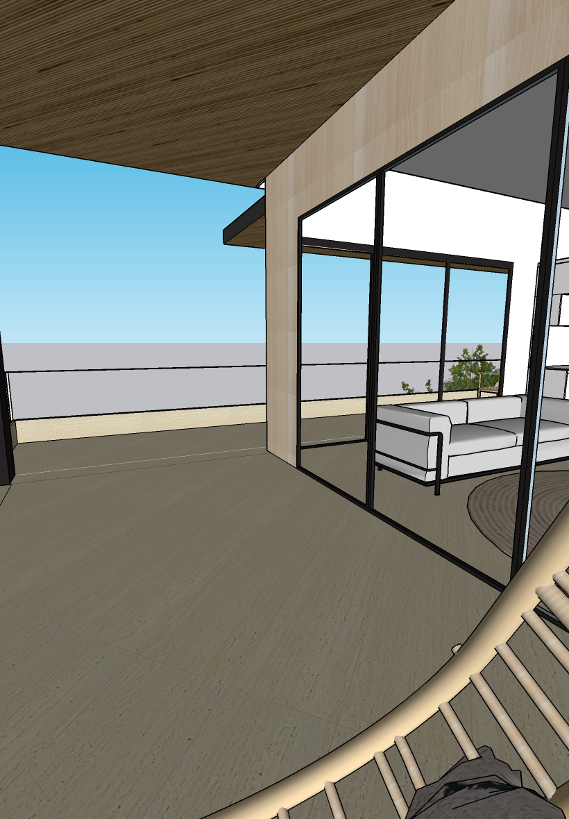render a modern balcony overlooking the ocean on the horizon with a beautiful warm and inviting atmosphere the wooden ceiling and exterior walls should have a natural light oak color while the large glass doors reflect a clear vivid blue sky the smooth floor should be a soft light oak adding a serene feel inside a cozy white sofa stands on a textured beige rug complemented by green potted plants in the background ensure the lighting is soft and natural casting gentle calming shadows