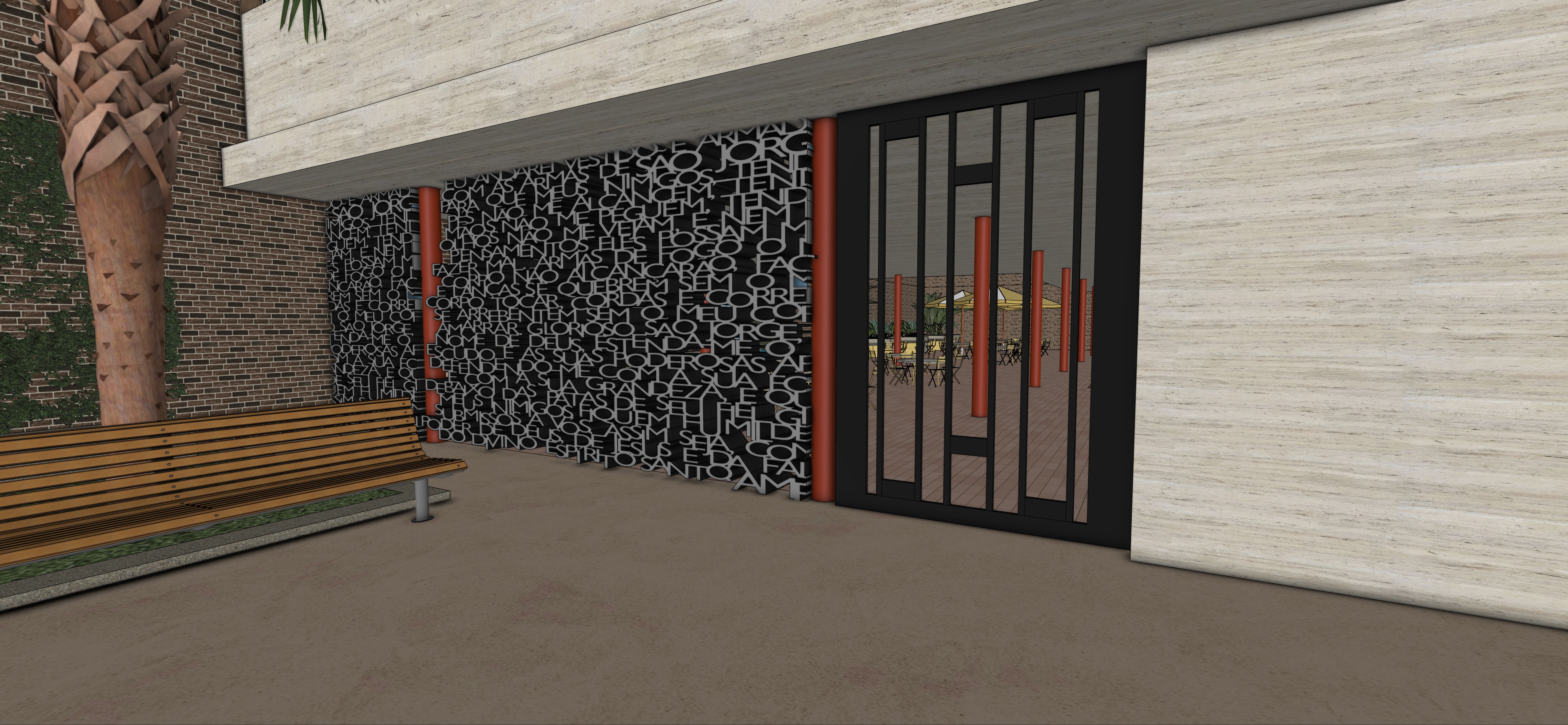improve the typographic metal screen perforated letter lattice so it matches the reference design a dense composition of overlapping uppercase letters forming a structural typographic screen made from thick corten steel plates keep exactly the existing architecture camera angle perspective materials and colors do not modify the building walls gate columns pavement vegetation or bench refine only the letter screen so it looks properly fabricated clean geometry consistent thickness steel letters accurate spacing and a coherent typographic composition similar to a sculptural steel letter lattice material of the screen weathered corten steel with realistic patina and thickness lighting daytime architectural photography sunny day with soft natural sunlight slightly warm tone clear sky balanced exposure no harsh glare or overexposure style realistic architectural photograph high detail sharp focus professional architectural visualization preserve the entire scene exactly as modeled and only improve the typographic steel screen quality and realism do not redesign the architecture maintain all the materials do not change materials geometry colors or composition