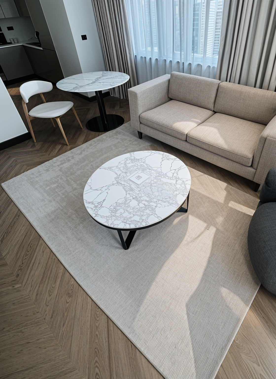 interior shot sostiytuisci il lampadario con uno di cristallo molto grande e prezioso il piano del tavolo in frassino chiaro con listelli a lisca di pesce il pavimento in parquettes di castagno a grandi riquadri l imbottitura delle sedie in velluto color panna architecture