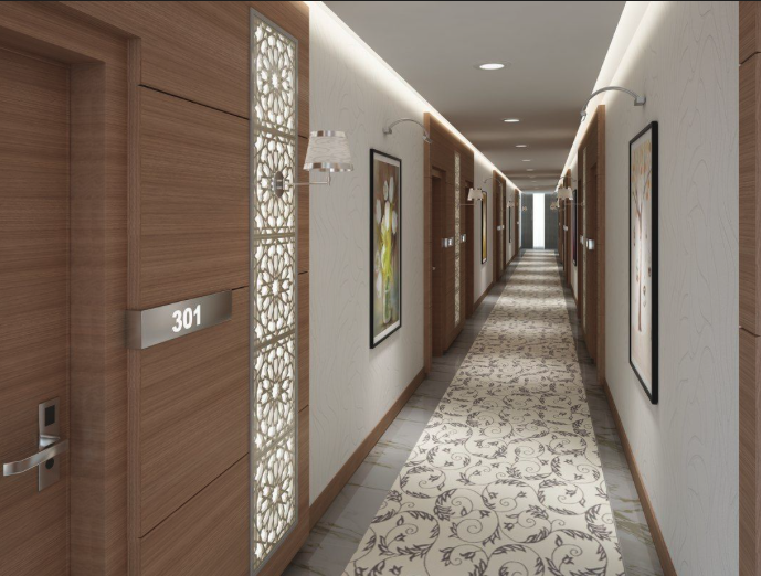 create a corridor based off of this image but add green wainscoting to walls where white walls are