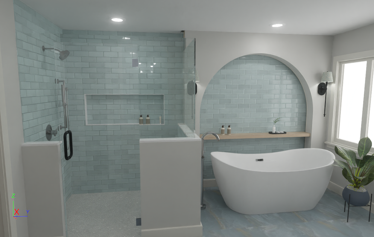 create a serene modern bathroom with a soft calming atmosphere focus on light blue subway tiles for the shower and feature wall complemented by light grey walls include a large curved white freestanding bathtub the floor should have a marble texture in soft shades of grey and blue add a wooden shelf with minimalist decor like a small plant and bottles include a tall green plant in a dark blue pot near the window use soft diffused lighting to enhance the tranquil mood make photorealistic do not change colors as in my original image
