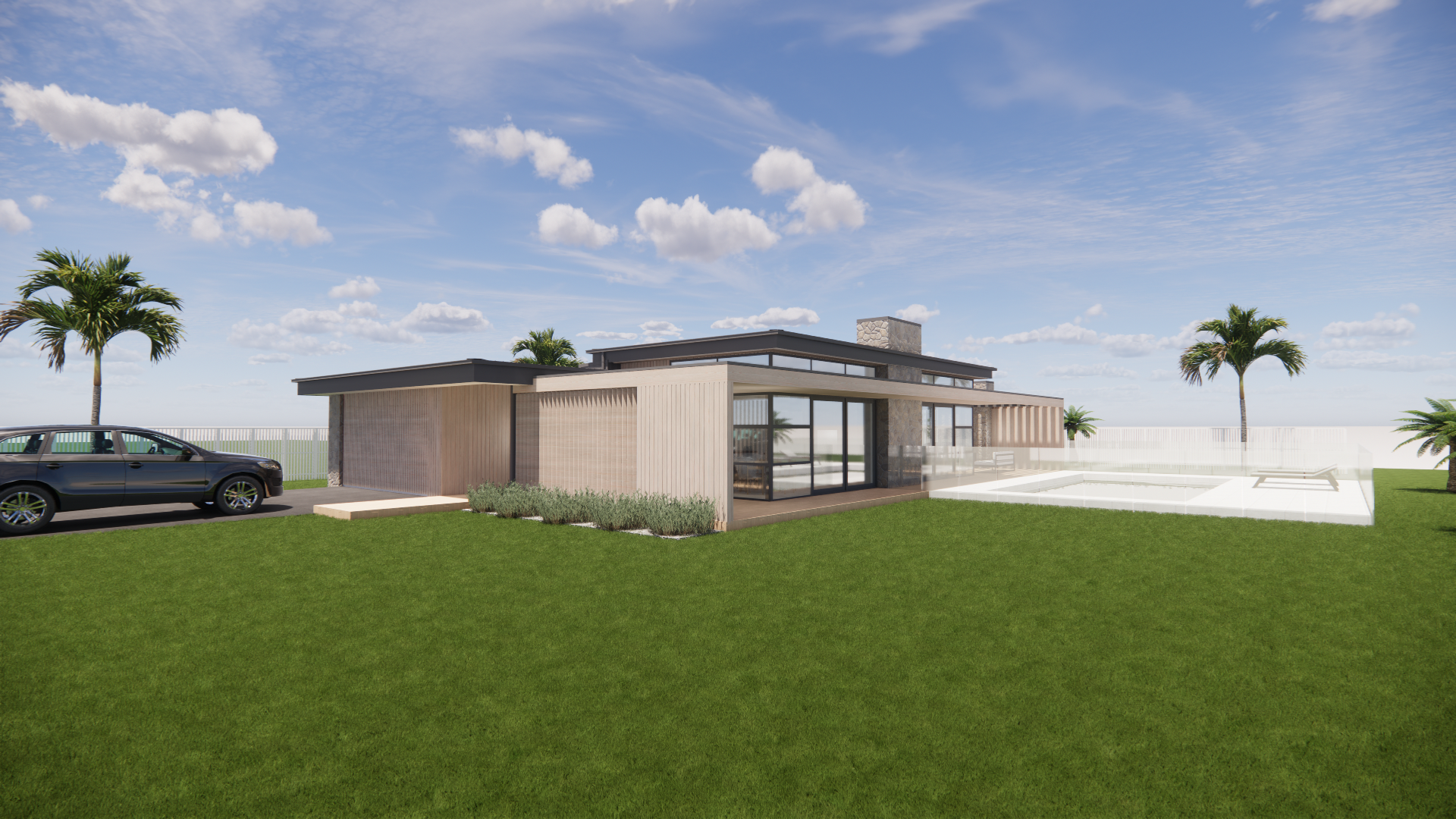 modern new zealand architectural home retain exact original house geometry proportions rooflines garage position entry placement and window layout with no structural changes maintain the same camera angle and perspective upgrade exterior materials to a refined landmark homes aesthetic apply a balanced palette of warm vertical timber cladding in natural cedar tones contrasting dark charcoal vertical cladding and light textured plaster elements introduce a feature natural stone chimney in soft grey tones and subtle stone detailing where appropriate refine the garage fa ade with clean high end detailing to match the home using either vertical timber or dark cladding with a modern flush panel garage door maintain simplicity and cohesion enhance glazing with large black aluminium framed windows and doors ensuring a premium crisp finish add architectural timber slat screening near the entry to create depth and visual interest without changing structure landscape with modern new zealand planting restrained architectural composition with grasses low shrubs and structured planting beds keep it clean and intentional not dense or tropical avoid palm trees include subtle natural textures like gravel or stone edging near the driveway lighting soft warm late afternoon light with slightly increased brightness compared to the original image ensure the fa ade is well lit with gentle shadows adding depth avoid flat or overly dark lighting rendering style high end photorealistic clean balanced contrast consistent with premium residential marketing imagery