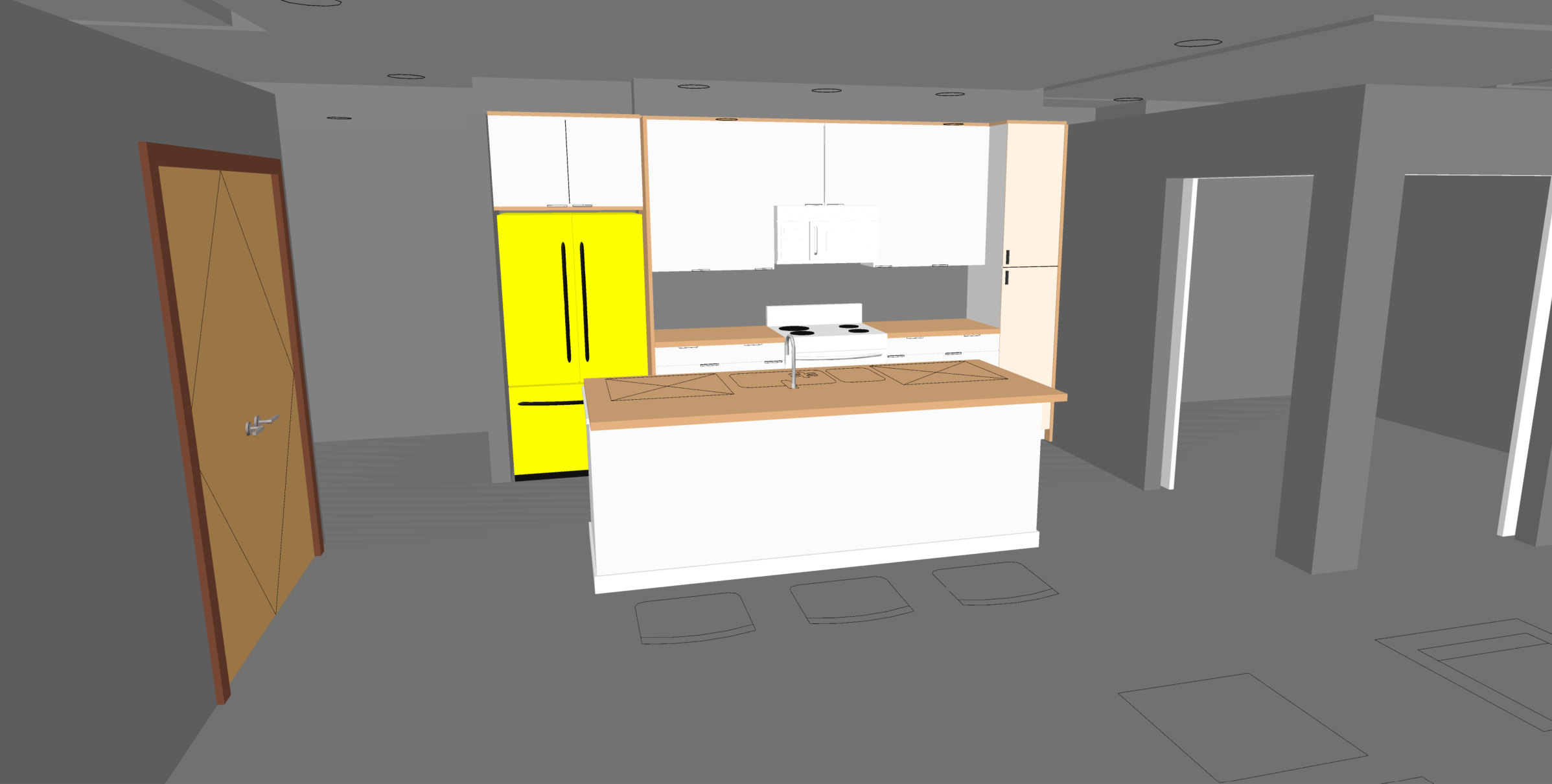 render this kitchen with light oak herringbone flooring medium walnut cabinets stainless steel handles fixtures and appliances walls painted flat white and base molding glossy white