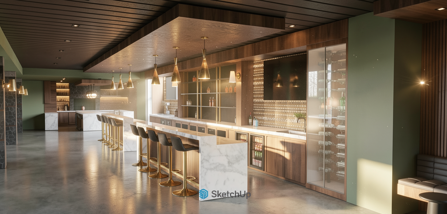 keep geometry and materials as shown grainy watercolor render of charming cottage building rear view with black wood siding off white stucco stone wainscot watercolor trees and prairie environment in the background extensive watercolor landscaping surrounding the building prairie landscaping in the background cozy atmosphere sloped down land to the left middle of the house is set back 18 feet from front gables