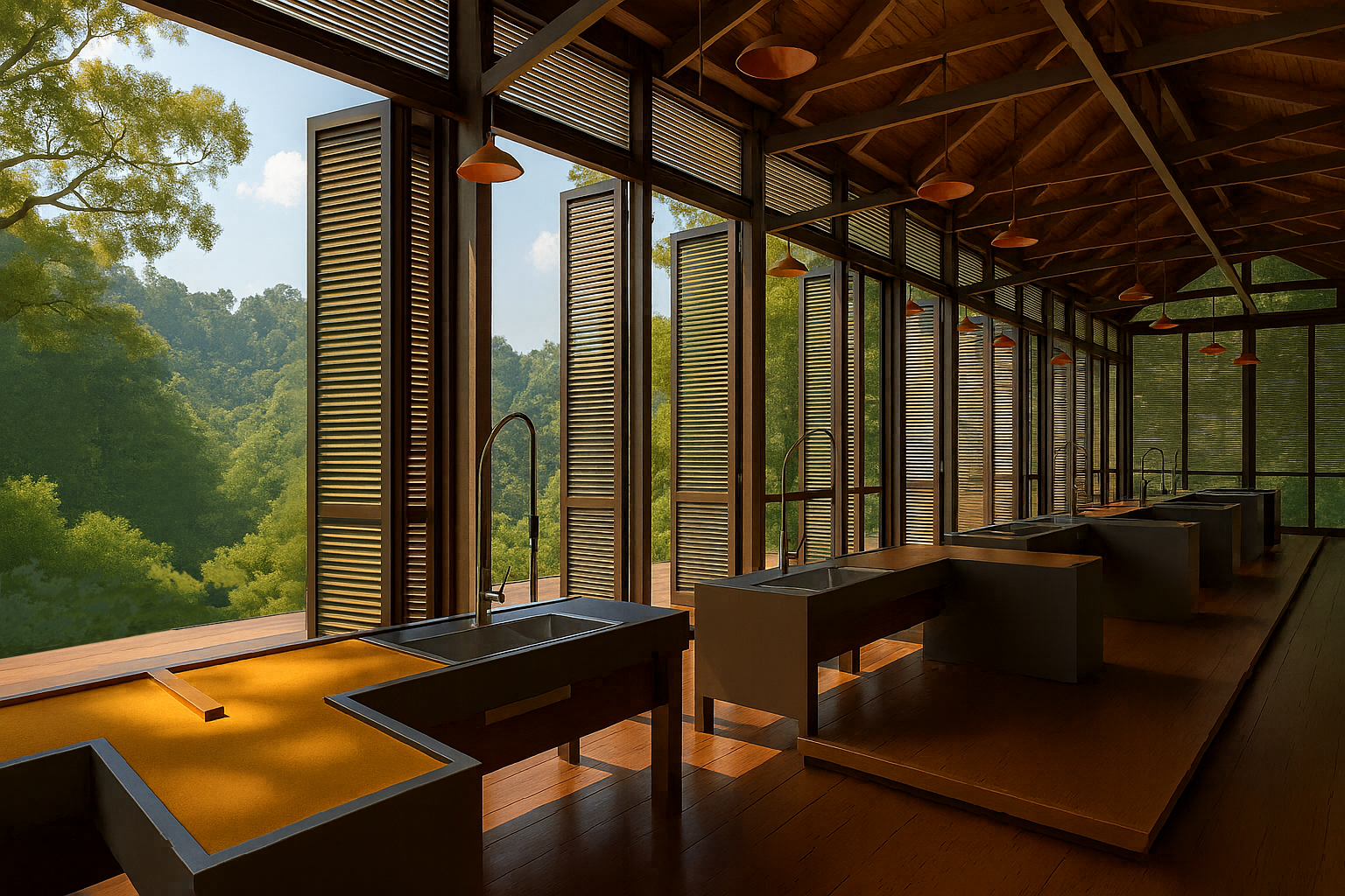 improve my japanese rendering give the floor a nice darker cherry planks type of texture b give all the lamps a bronze texture c give the roof also a raw wooden material d give the shades a white texture e give the roof a lighter wooden texture f give the porch the same texture as the floor g set the surrondings as a beautiful woods in the middle of oaxaca mexico architecture