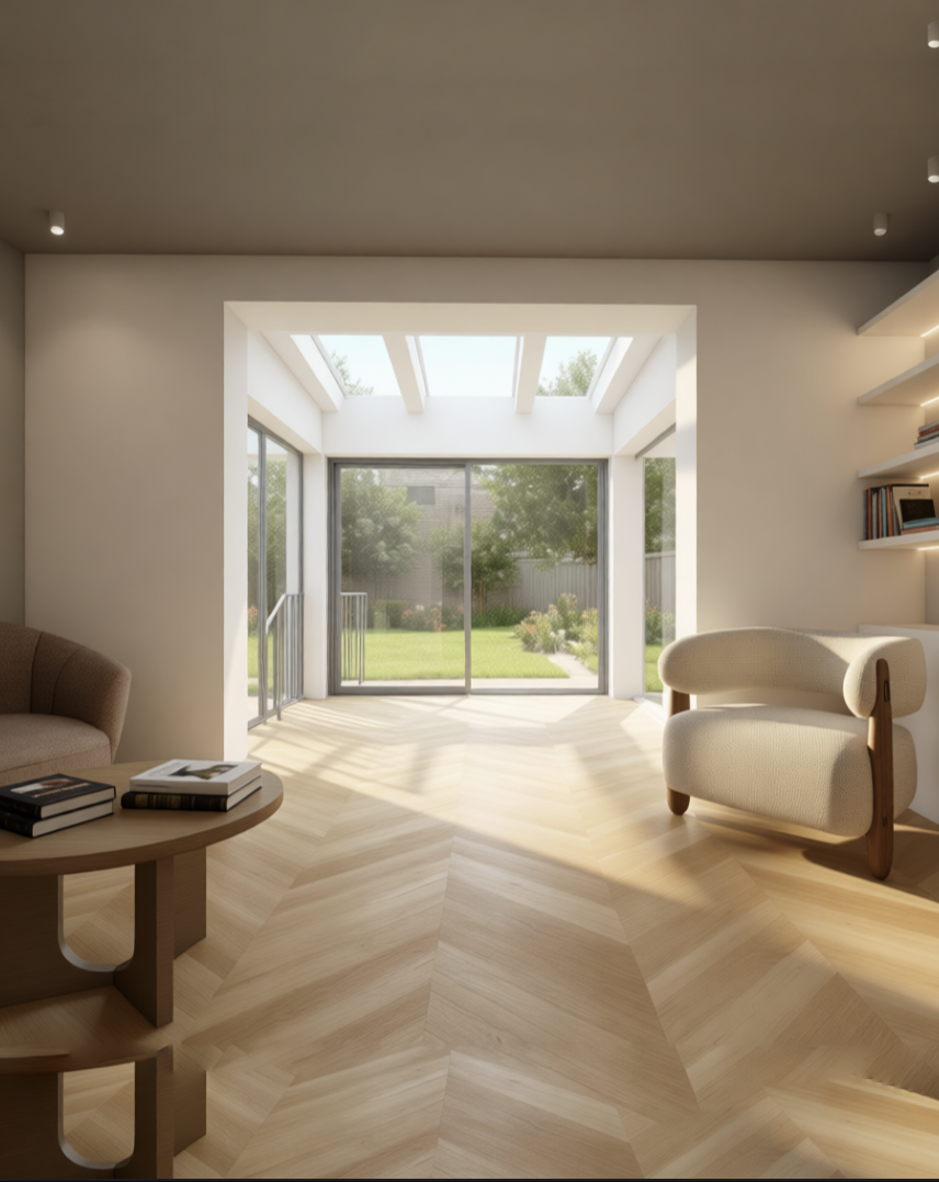 the flooring is herring bone natural oak wood remove the duplicate coffee table on the bottom left corner keep the coffee table with the books on top