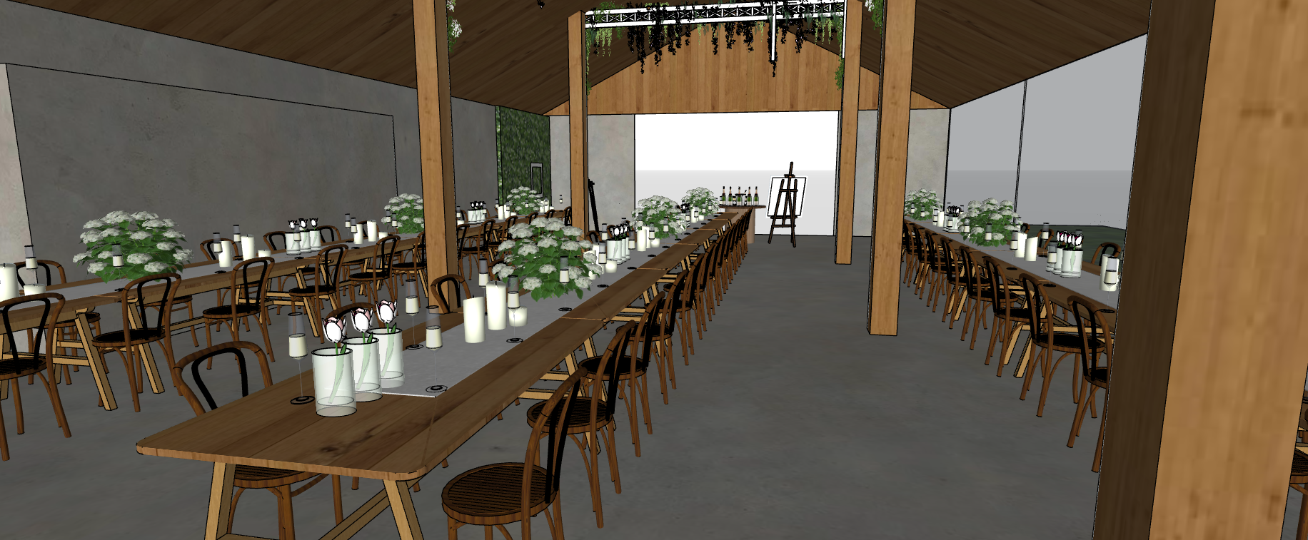 render my sketchup model of a wedding venue interior keep all existing geometry and textures exactly as they are do not add remove or change any walls windows or structures make the materials and finishes photo realistic through the existing windows only show a vineyard landscape in the background use warm sunset lighting with soft shadows for a romantic atmospheric mood
