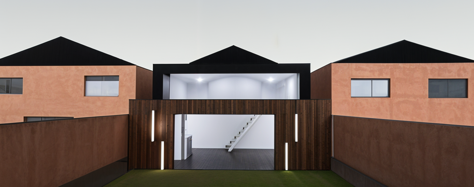 mountain modern home in a neighborhood with pine trees and aspen trees natural looking landscaping warm lighting dark brown wood siding grey brown stone veneer accents on fireplace and wainscot black window frames black standing seam metal roofing remove clerestory windows on high roof darker brown siding snow on ground in the yard open metal chimney cap colored black remove window on left side architecture