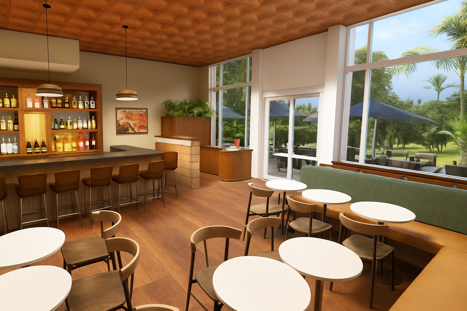 golden hour sunlight long shadows ambient lighting around the pool warm reflections serene and elegant resort feeling