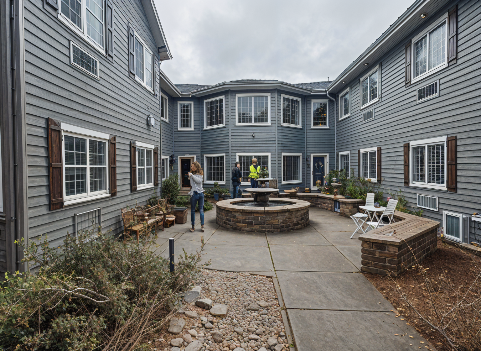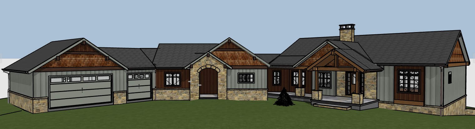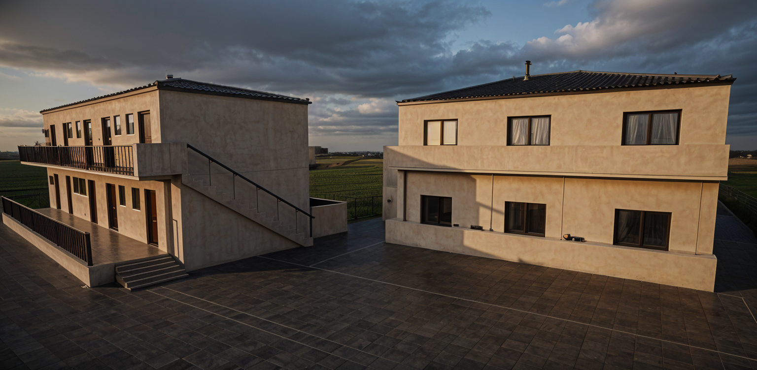 make rendering photorealistic keep architecture materials and colors the same add driveway and walkway bushes and low mountains in background