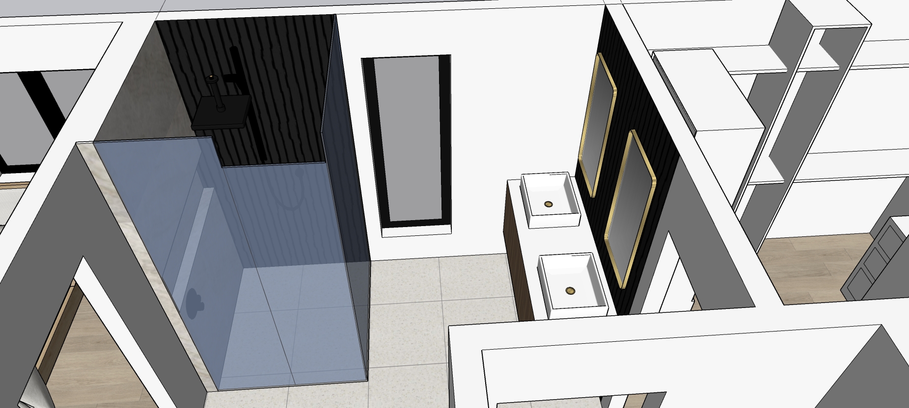 night view with under cabinet lighting and shower niche lighting