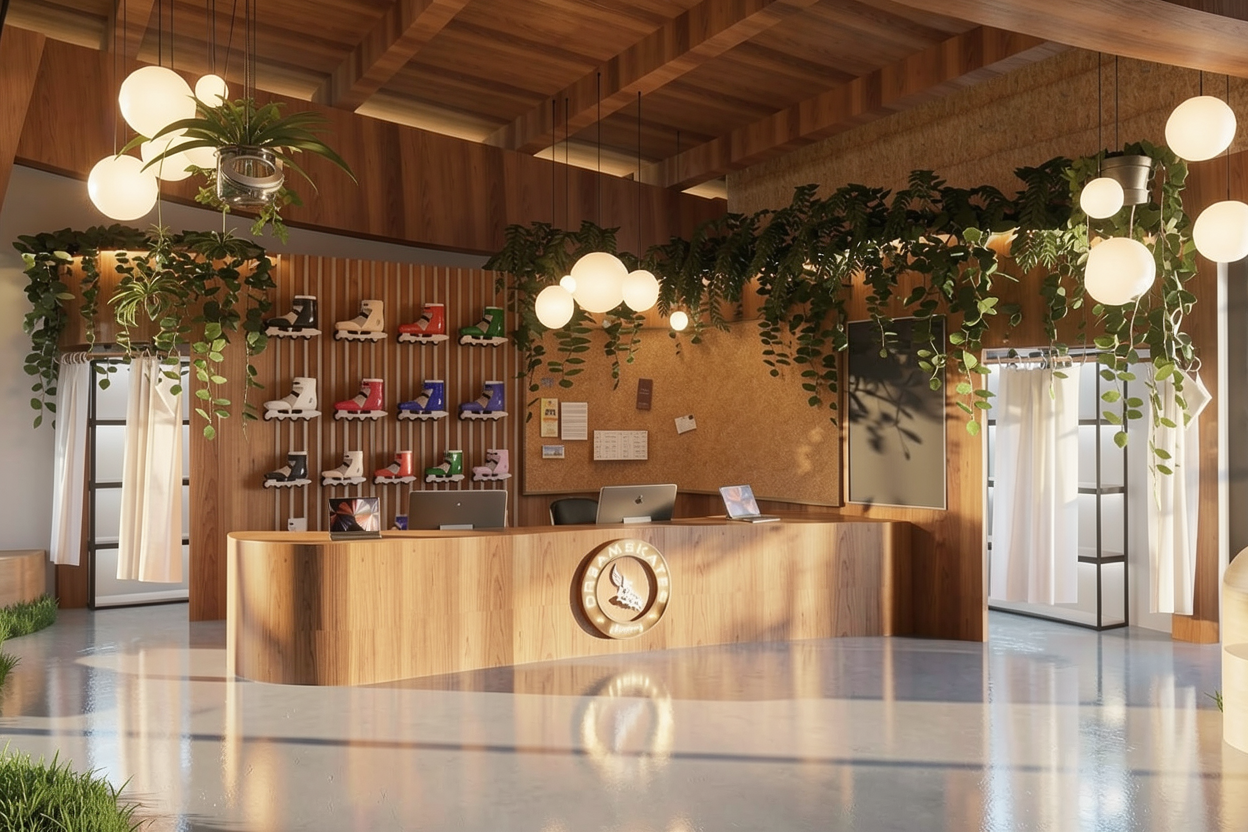provide a photorealistic rendering keep all the elements proportions and materials as they are provide north daylight through the glass only add linear wall wash illumination at the bronze wall keep logo as is
