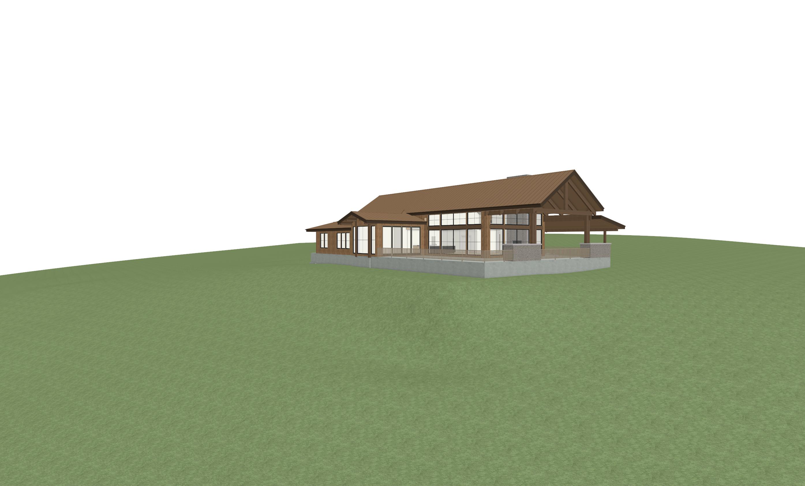 this house is in montana add pine trees and native montana vegetation make wood siding ghost wood like jackson hole house keep rock on face of house make oustide golden hour make golden light coming from inside house add fire pit to patio make rock patio that wraps around right side of deck its a big rock patio starting from left side and wrapping around right side of deck make patio wide patio should be at least 20