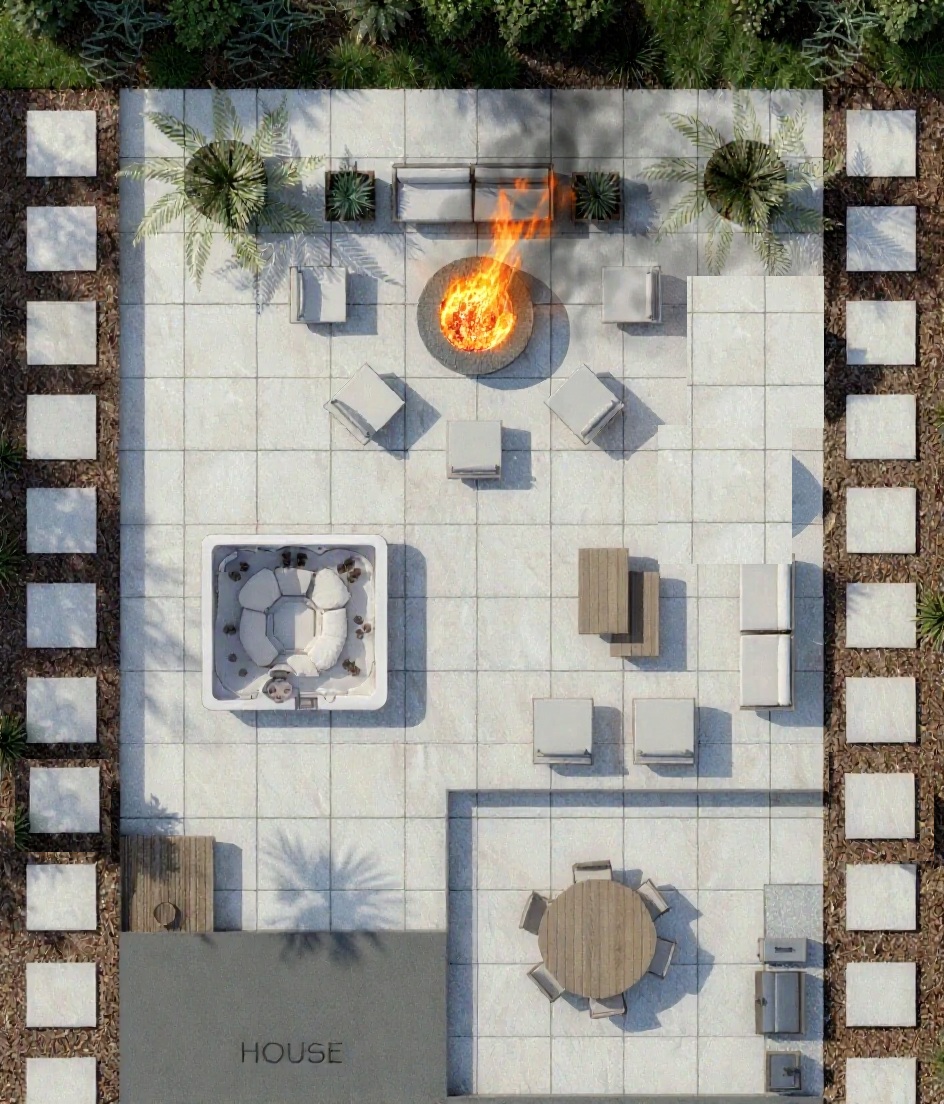 using this floor plan as reference transform the outdoor area into a realistic beautifully designed space include modern and stylish outdoor furniture such as sleek lounge chairs elegant dining sets and decorative planters maintain a harmonious layout natural lighting and realistic textures for all surfaces creating a welcoming and contemporary outdoor environment keep the perspective and proportions consistent with the original floor plan