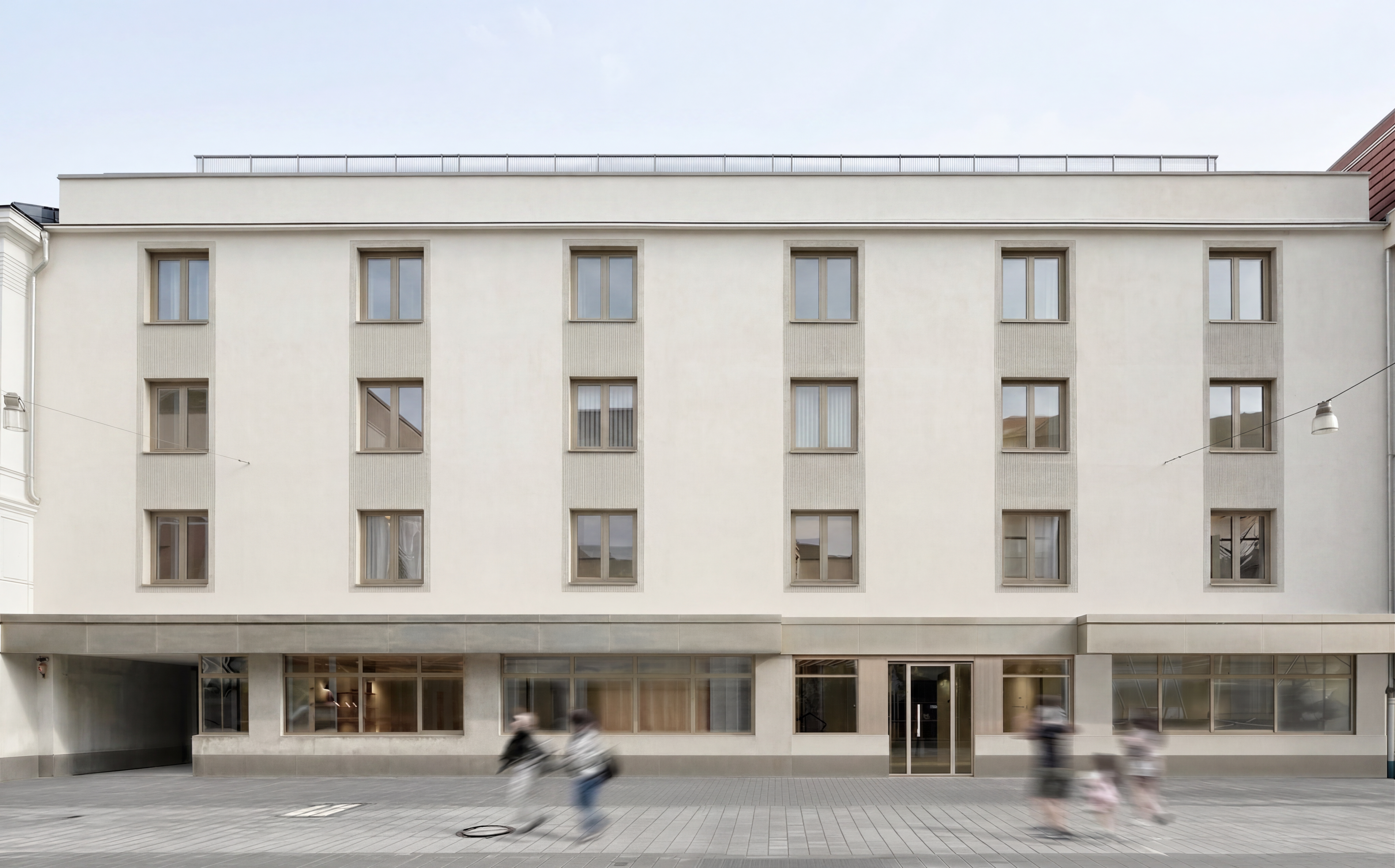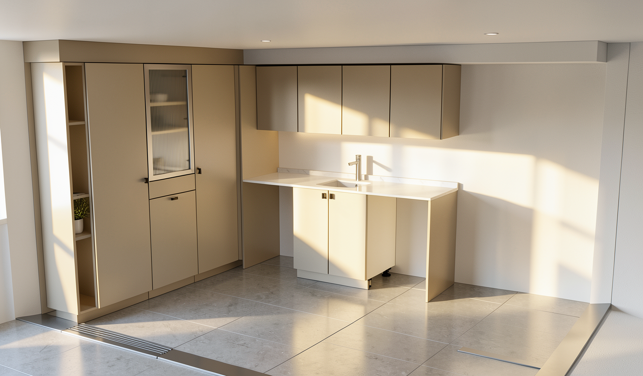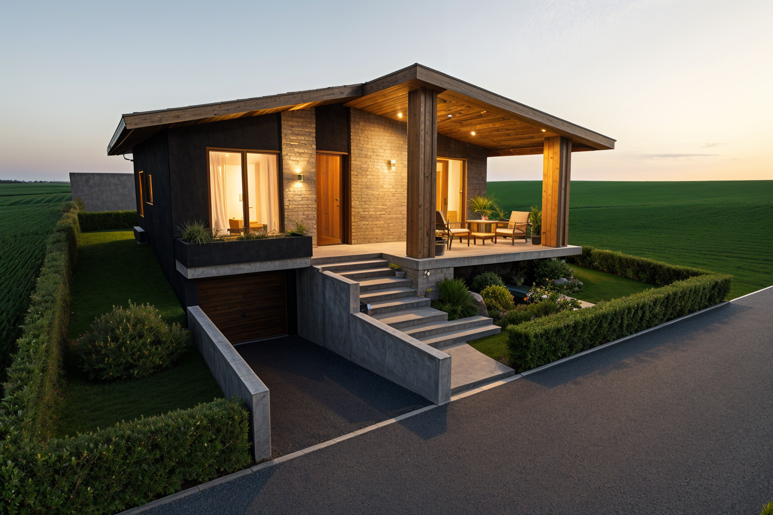 open plan kitchen with large dining table in foreground close to camera