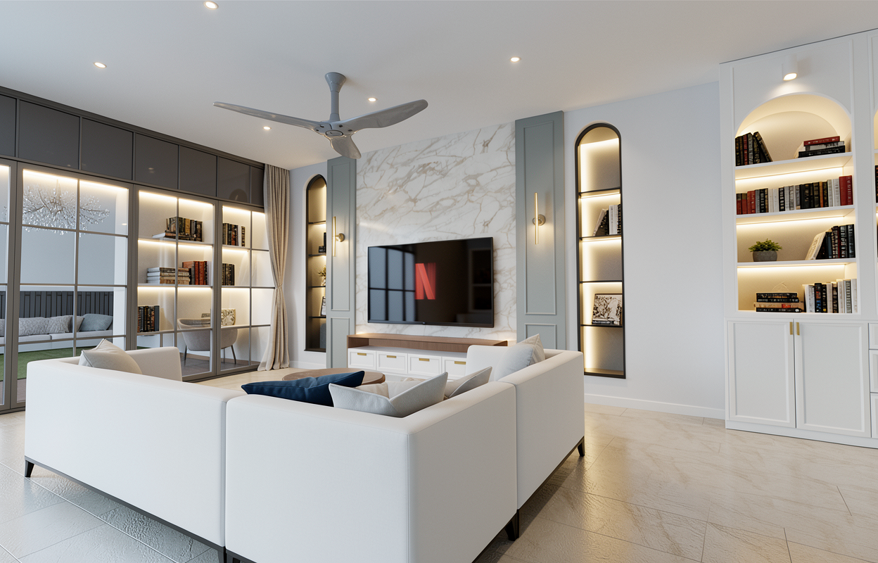 render this make the floor white speckle vinyl add a receptionist add a person sitting the the waiting chair with a dog add depth to the homeward tails logo add evening sunlight from the left