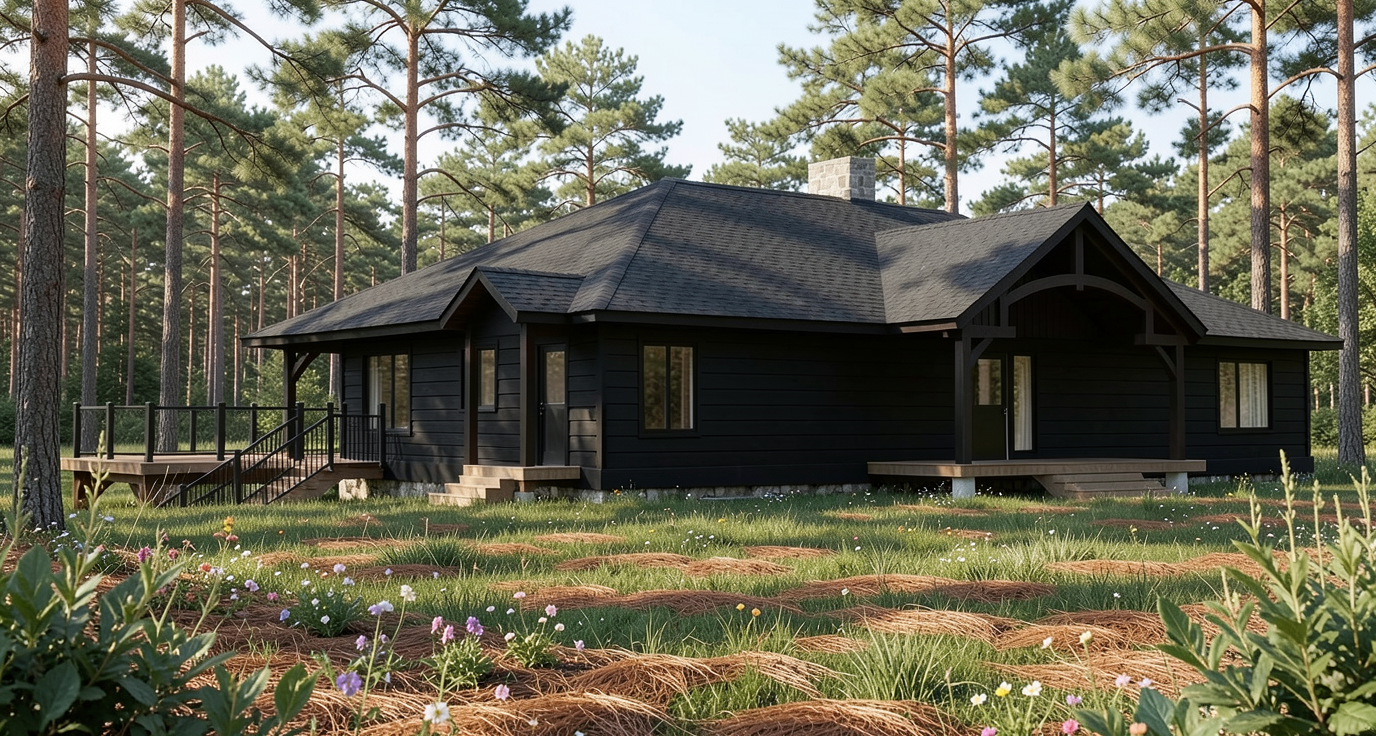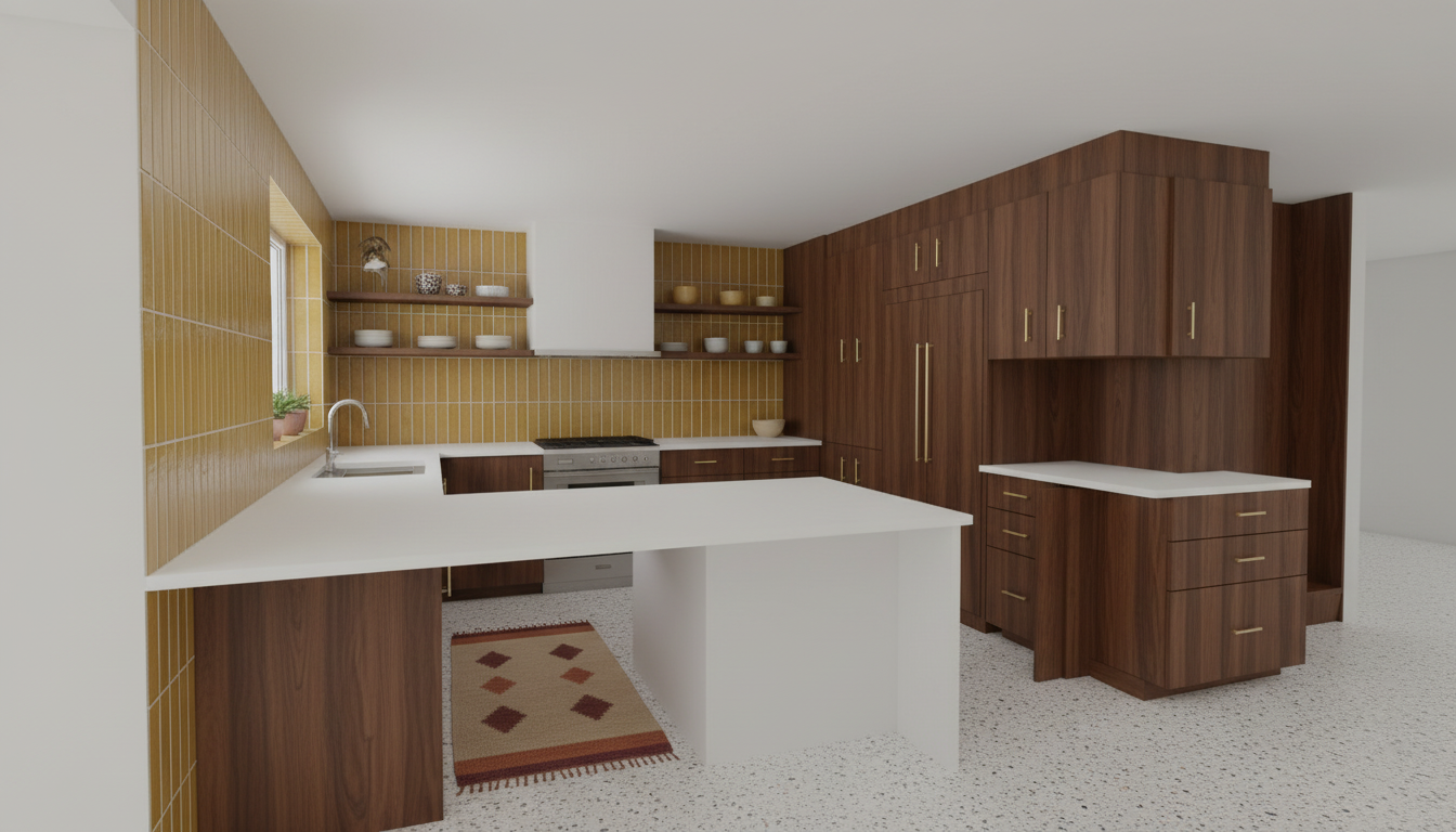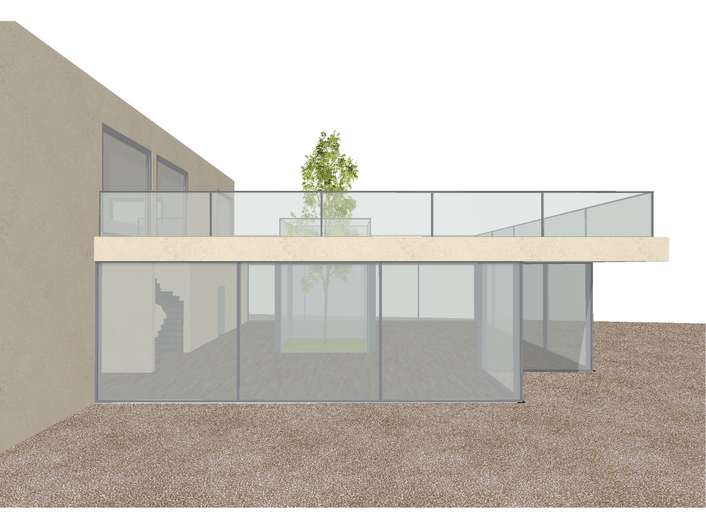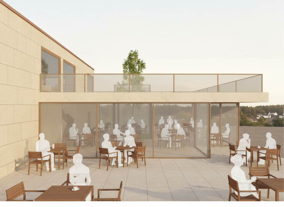 in front a terrace caf scene with brown wood outdoor furniture tables and chairs populated with semi transparent people sitting in front oft he building talking drinking coffee include a glass railing around a planted tree existing tree preserved realistic reflections and light style scandinavian minimalism clean geometry high realism soft warm lighting color oft he lightning warm yellow beige camera eye level perspective wide angle slightly from the corner facade made of sand limestone slabs format 120cm wide and 60cm high windows made of oak terrace floor made of sand limestone slabs format 120cm wide and 60cm long flat roof with a copper plate cover on the edge of the roof in the background is the city of b dingen small town with trees