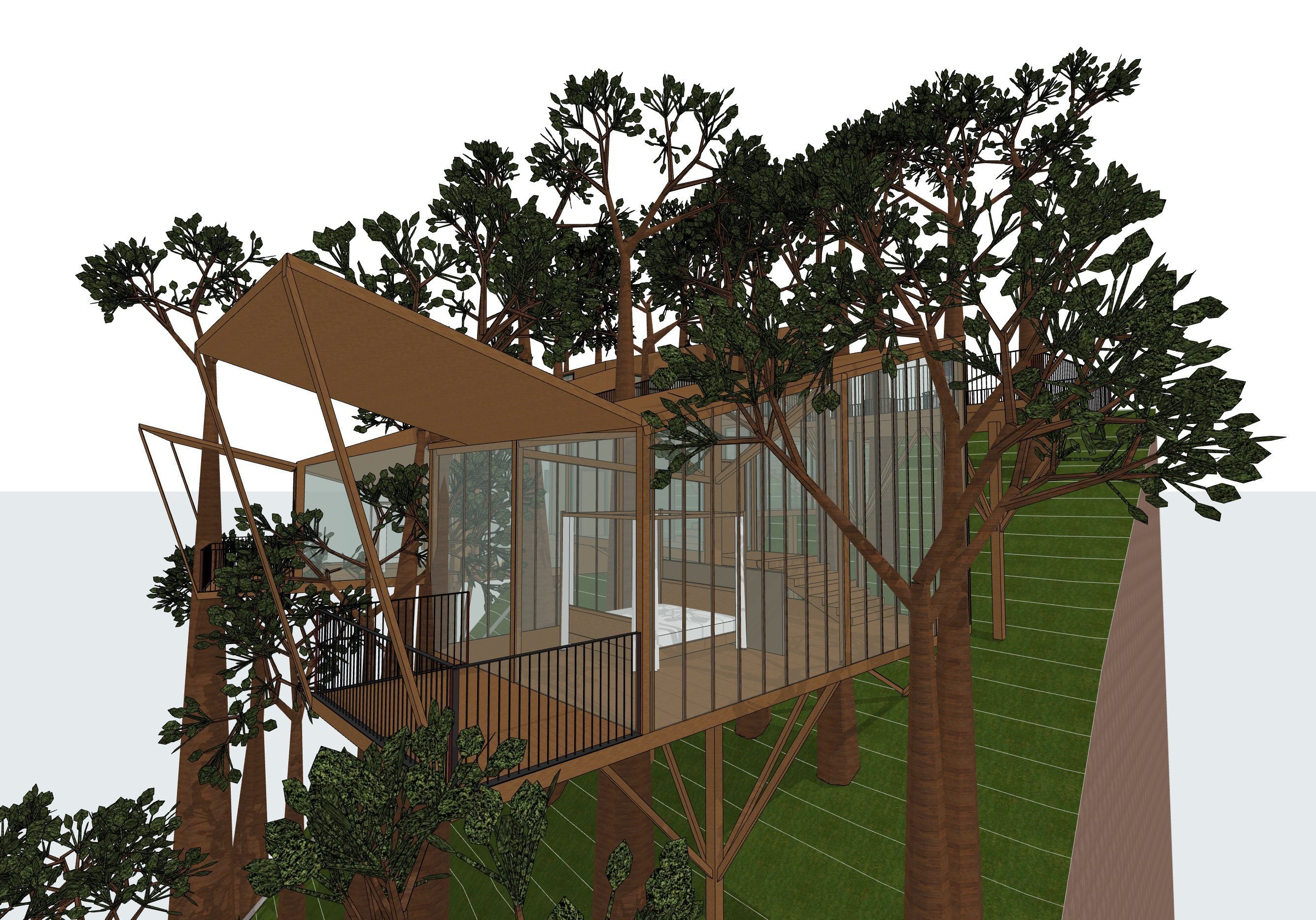 a lightweight treehouse pavilion is perched on a steep grassy slope featuring a slender timber frame and expansive floor to ceiling glass walls the structure is integrated into a dense grove of mature trees with its thin roof plane and black metal balcony railings emphasizing an ephemeral quality the building is elevated on thin supports appearing to sit lightly on the earth bright sunlight filters through the surrounding verdant foliage casting soft shadows across the wooden decking and glass surfaces under a clear sky