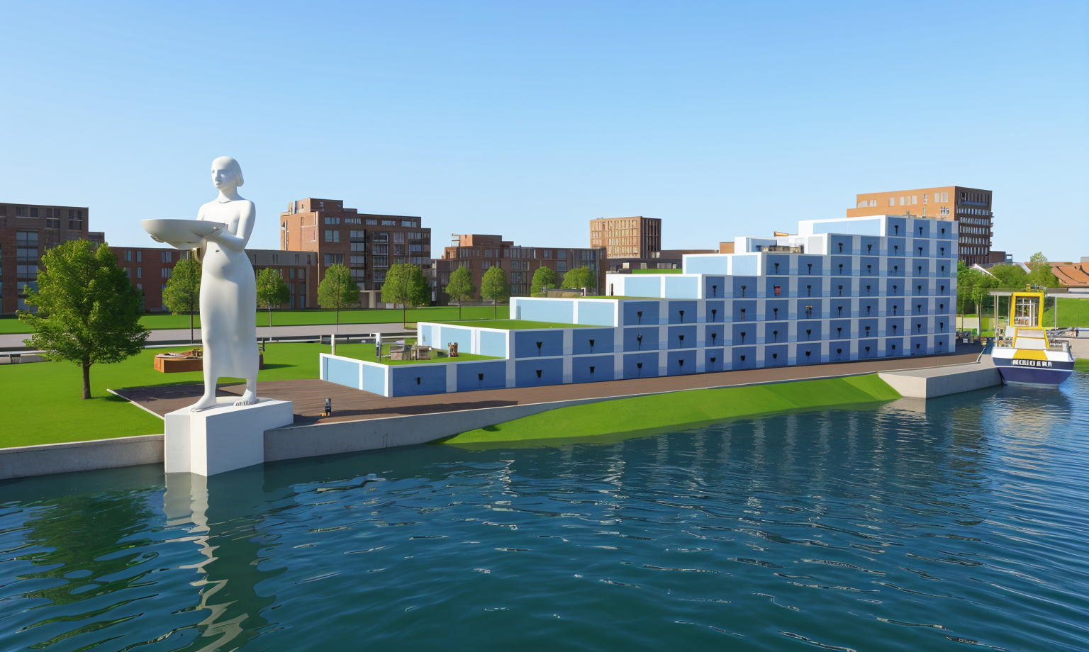 render a vib warantterfront scene featuring a modern stepped building with lots of people plants and terrace furniture on the balconies there are large roof terraces on the building with lots of people furniture and plants include a large elegant statue holding a bowl surround the area with lots of lush green trees and well kept green lawns add lots of people plants flowers and city furniture around the building the water should be a deep calming blue with gentle ripples the background showcases a blend of historic and contemporary brick buildings in soft earth tones the atmosphere is vibrant and inviting with a bright blue sky with a few clouds above to highlight a sunny day