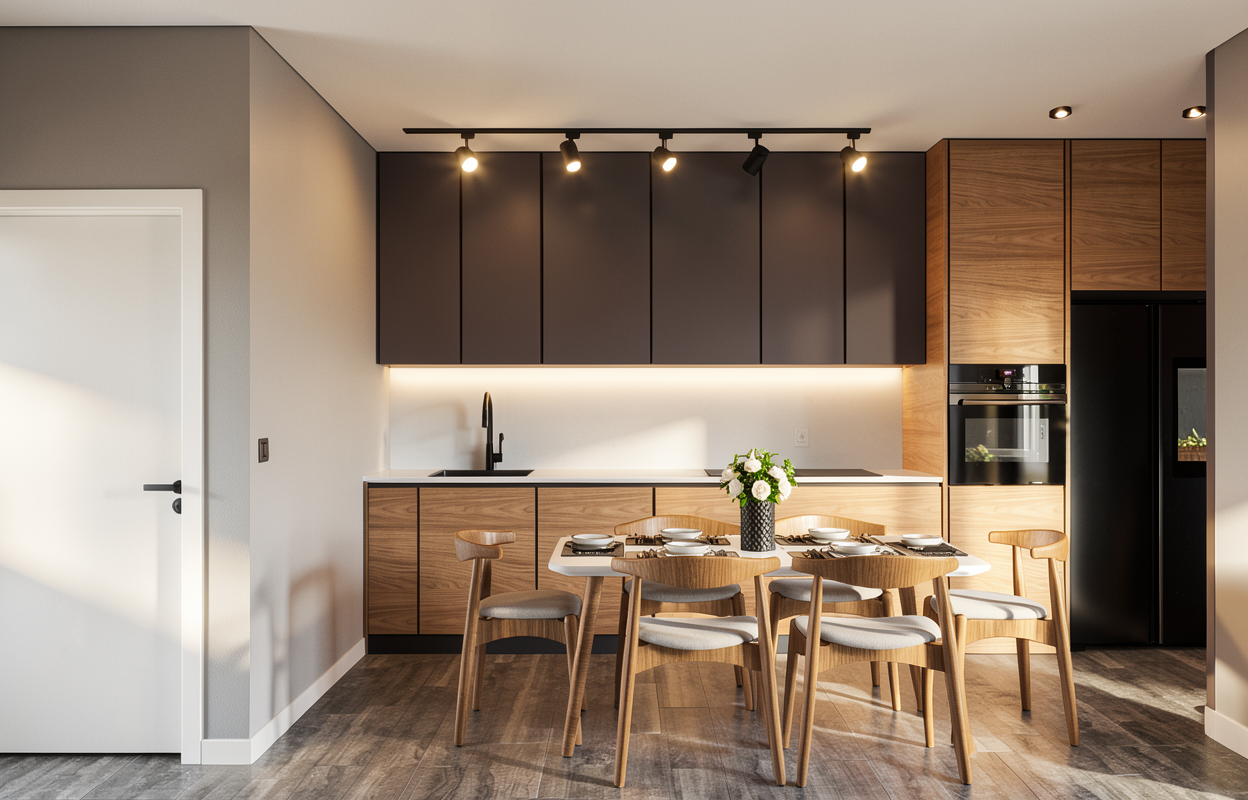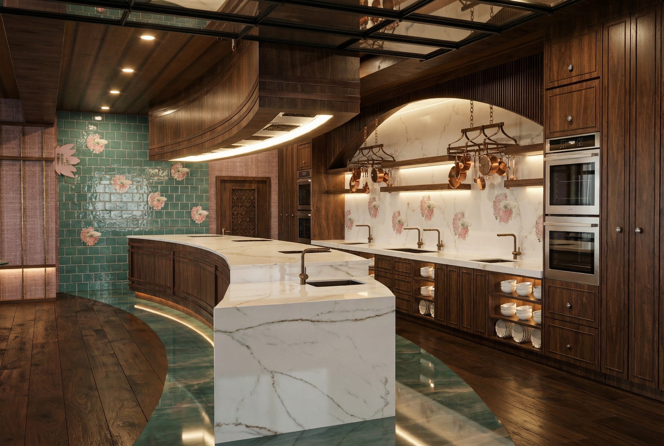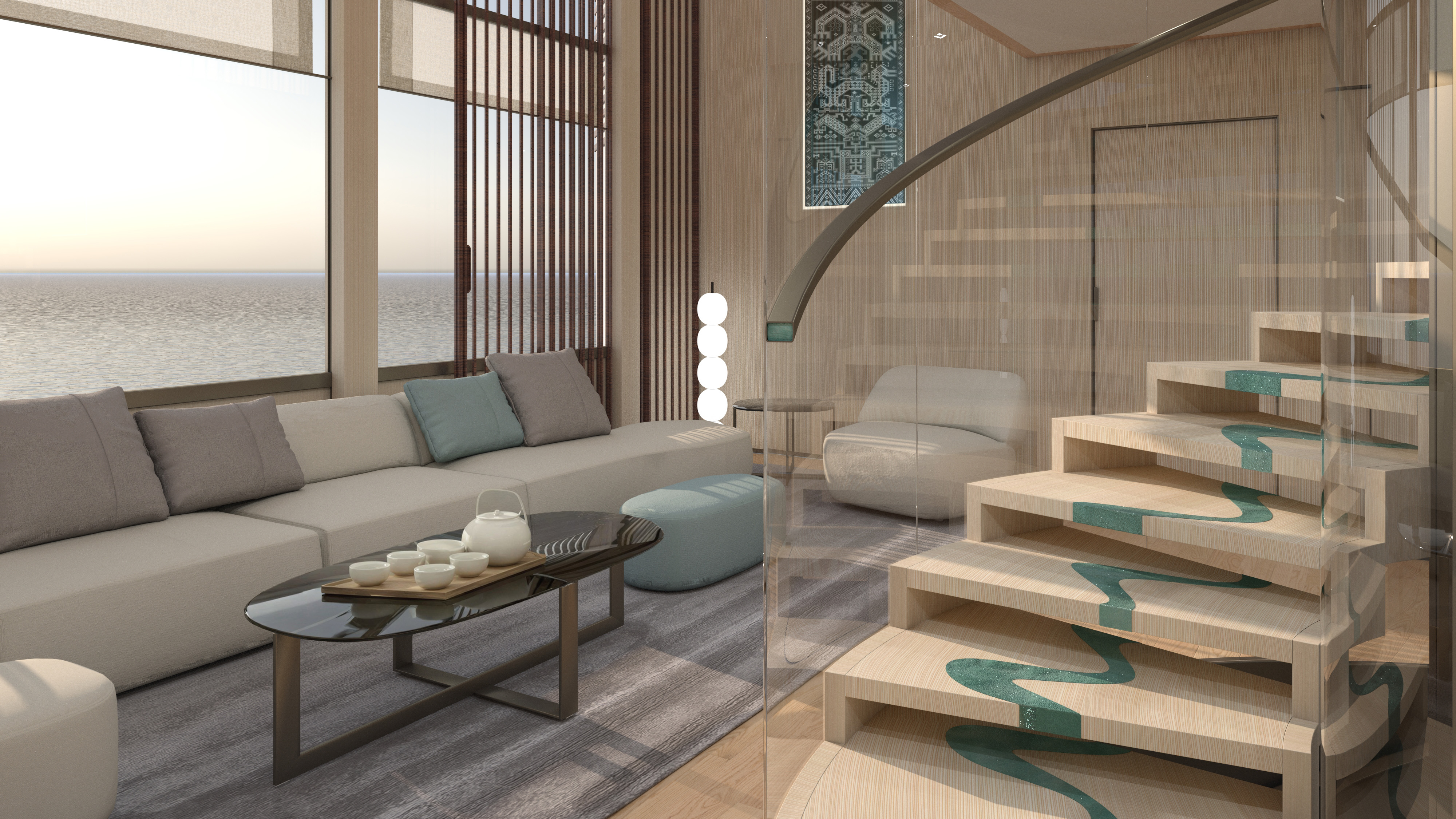 starting from the current displayed rendering exactly as it is do not modify any architecture staircase furniture lighting flooring ceiling or bamboo plants focus only on the back wall where the framed panels currently hangs remove this green framed panels but leave the recessed back wall surface otherwise unchanged in the recessed vertical zone where the framed panels was insert a refined hainan huanghuali wood panel carve the li brocade pattern into these huanghuali panels in a continuous relief from top to bottom covering the full height of each recessed panel and also the width of this recessed niche make the carved pattern slightly more visible through enhanced light and shadow contrast without altering the surrounding wall color do not extend the huanghuali material to the central wall behind the staircase or to any other surface only modify the vertical recessed niche