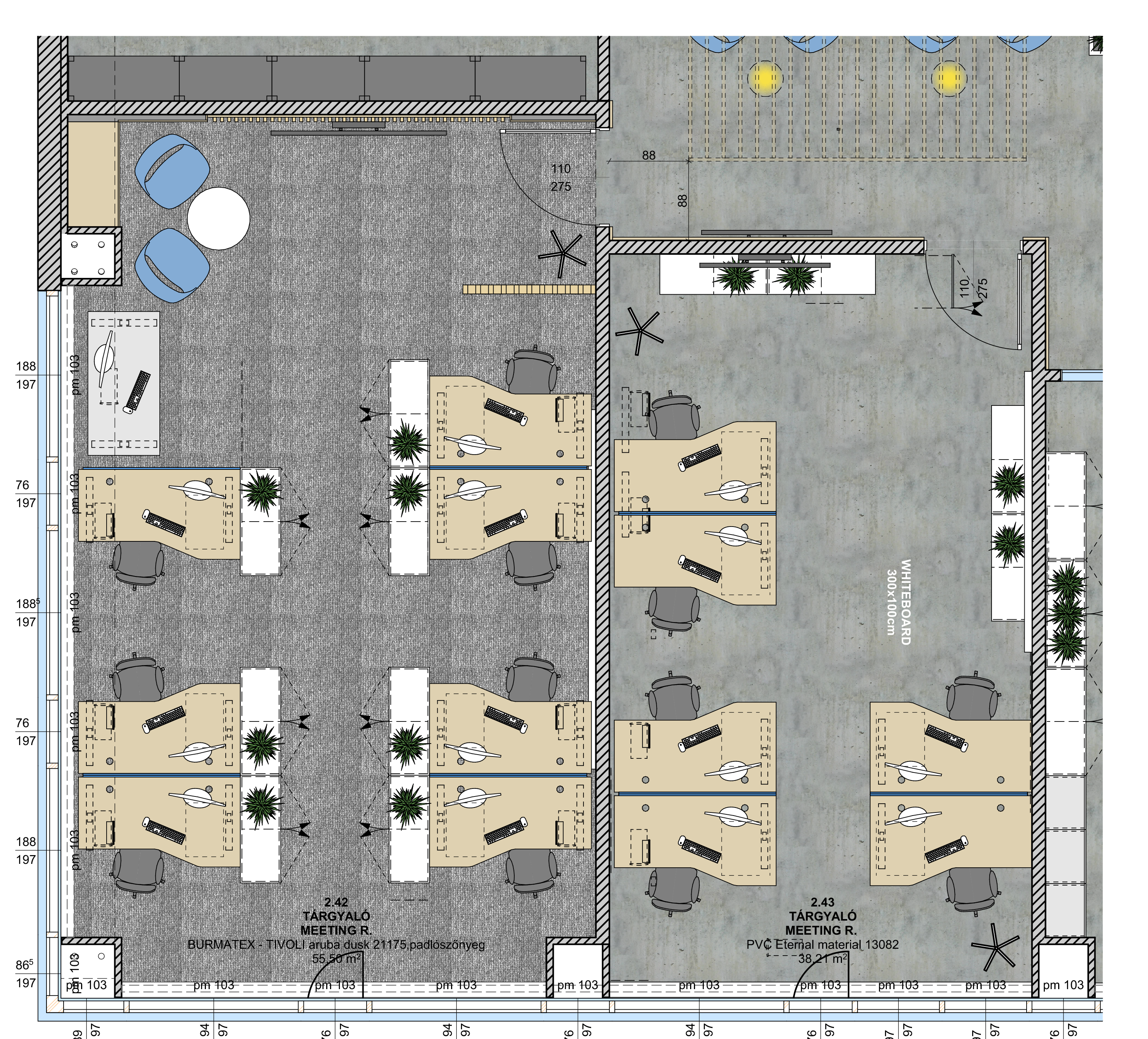 this floor plan is a top view perspective with a photorealistic look walls are white with grey hatching on the floor drawing the floor is grey office carpet the tables are light oak the boxes are 90 cm high and white the boxes have small flowers the office chairs have grey upholstery one or two people can walk and sit