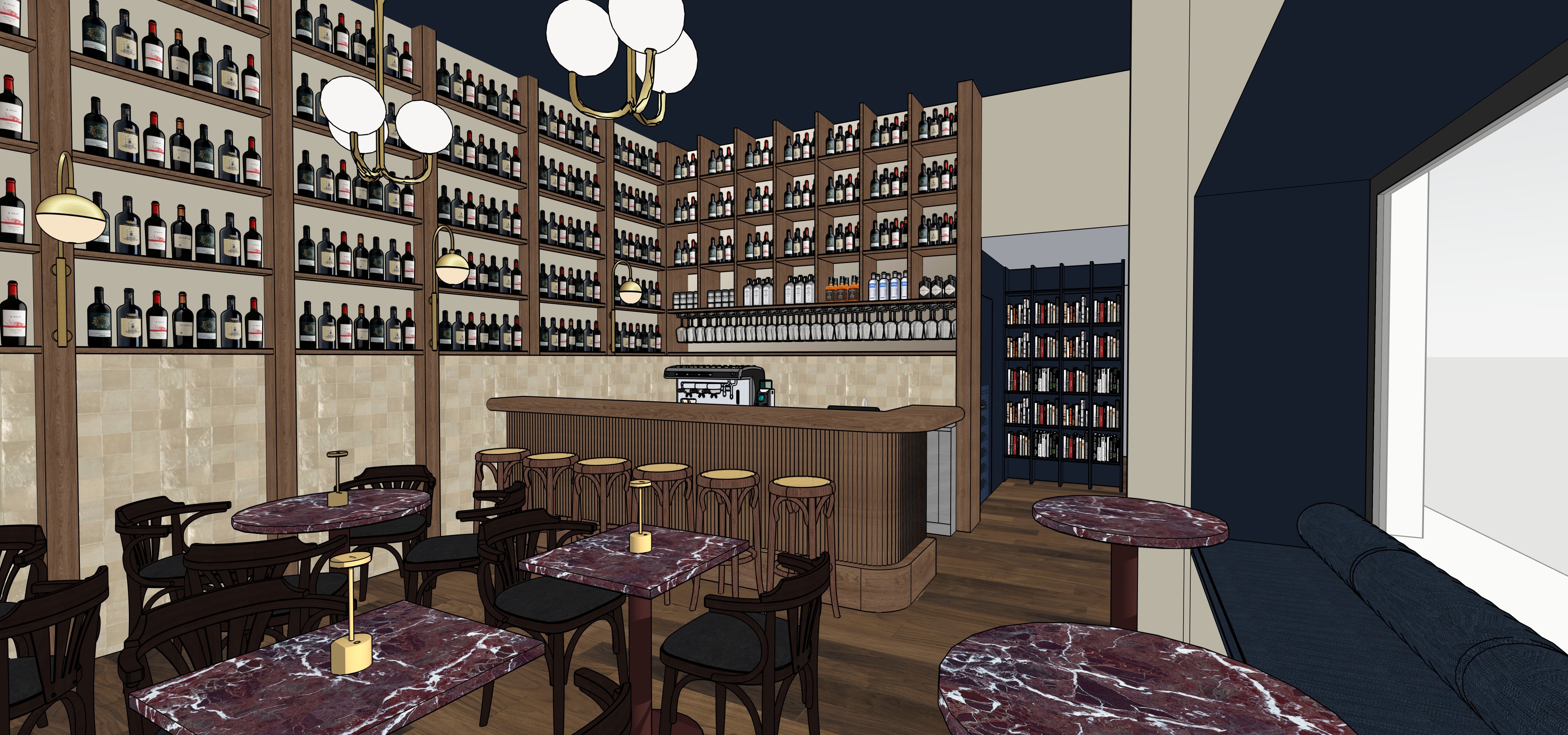 interior of a wine bar soft lighting not too bright it should be cozy pendant lamps from the ceiling wall lamps and table lamps the wine shelf has indirect lighting too the floor is a dark oak wood the tables are in a rosso levanto marble the ceramic tiles at the bottom of the wine shelf should look like metallic tiles in a champagne color the walls are also in a soft champagne color the ceiling and is in a dark blue the bar is wood same color as floor und the bar top is rounded