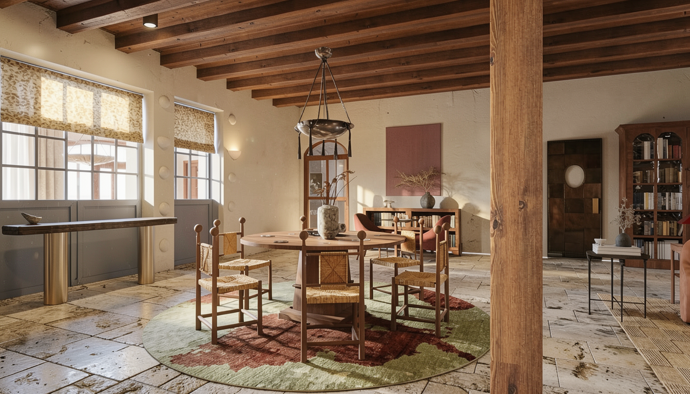 high tech interior shot i would like to have bordeaux sofa with rug under it with the same color the kitchen cabinet is bordeaux the lower upper cabinet is dark wood also the kitchen island is dark wood the backsplash and the countertop is beige marble the walls have beige painting the table and the lamps are bronze tha dining chairs are beige put some barstool chairs next to the island with bronze legs put beige curtains on the windows and spot lights where needed kitchen architecture