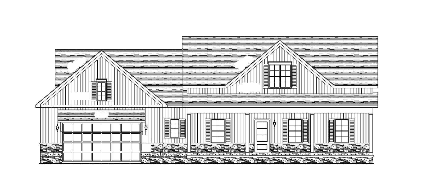 make as photorealistic as possible while keeping textures and architecture the same as selection add professional landscaping in a lightly wooded scene with good lighting in bowling green ohio match materials to plan and remove any texts and tringle shapes on roof colors selections are as follows board and batten siding to be white corner boards to be white shutters are to be black entry door with glass panel to be painted sherwin williams tricorn black sw 6258 entry door will have an schlage plumouth satin nickel door handle and deadbolt the windows window trim fascia and soffit to be white the porch posts are to be stained sherwin williams charwood mw 439 shingles to be certainted landmark dimensional multi layered shingles in moire black and the stone color is to match provia silverton ridge cut stone with white grout